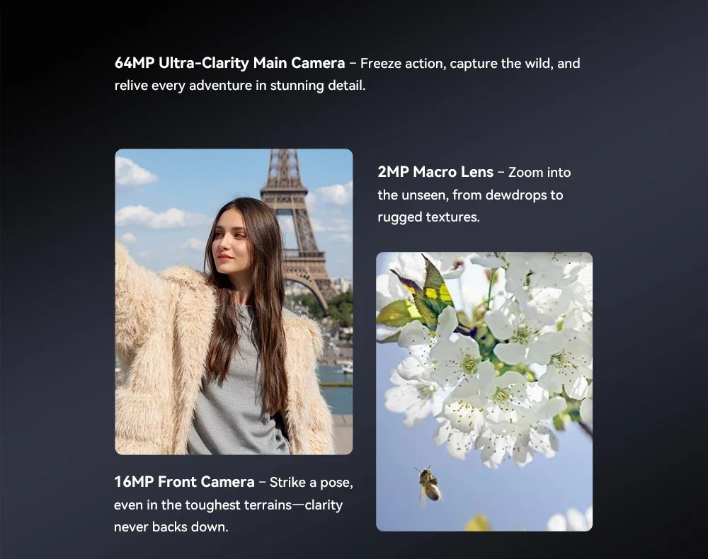 64MP Ultra-Clarity Main Camera– Freeze action, capture the wild, and relive every adventure in stunning detail.