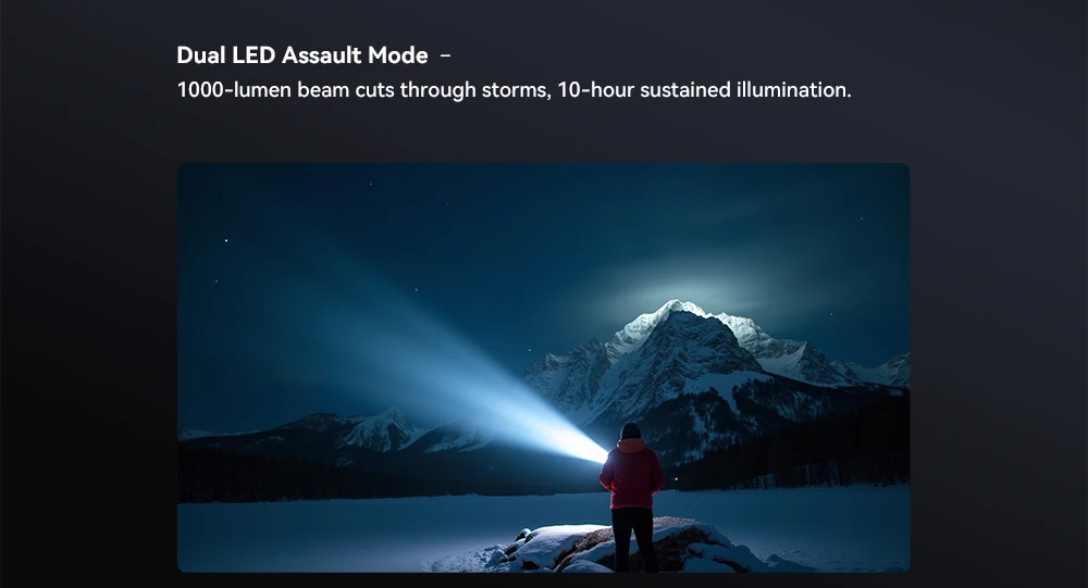Dual LED Assault Mode– 1000-lumen beam cuts through storms, 10-hour sustained illumination.