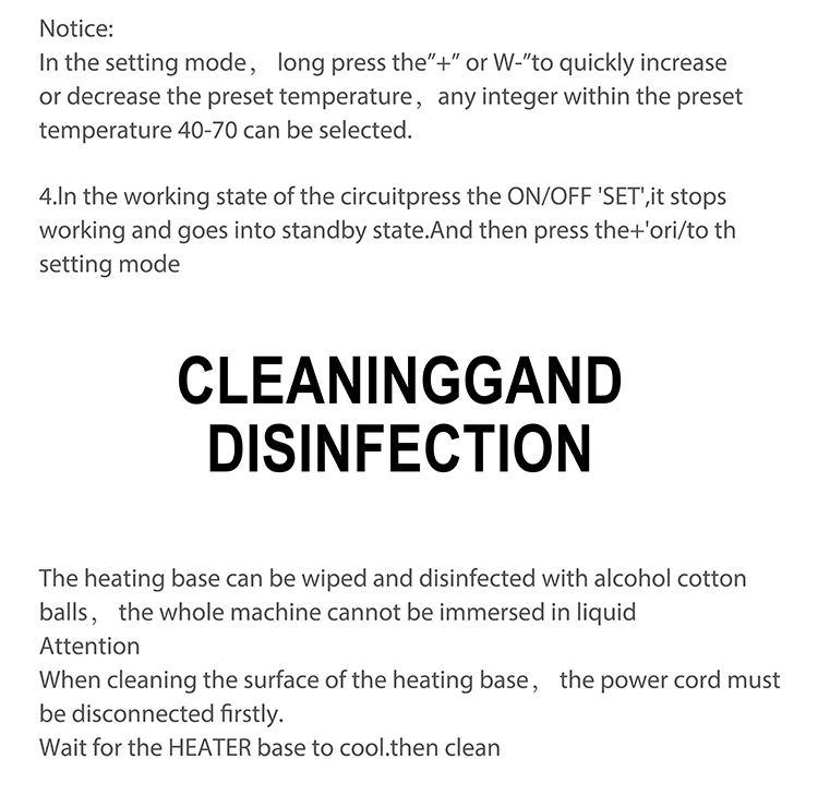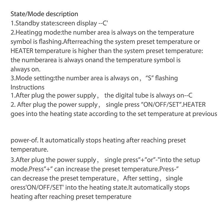 2.3 After plug the power supply,single press “ + ” or “ – ” into the setup mode.Press “ + ” can increase the preset temperatue.Press “ – ” can decrease the preset temperatue.After setting,single press “ ON/OFF/SET ” into the heating state.It automatically stops heating after reaching preset temperatue.