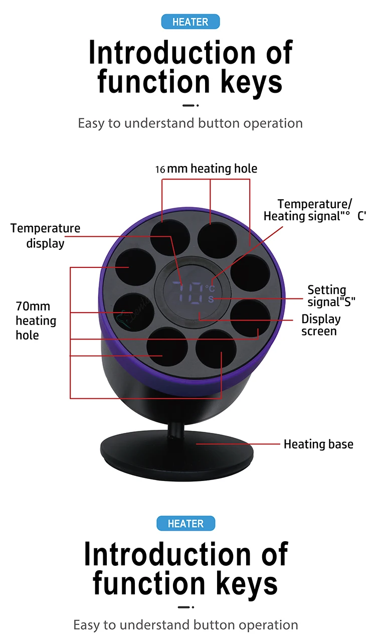 Heater use the precision circuit control module to heat,control the temperature tolerance within 1 degree,According to your choice of material and it can set any integer temperatue within 40-70℃