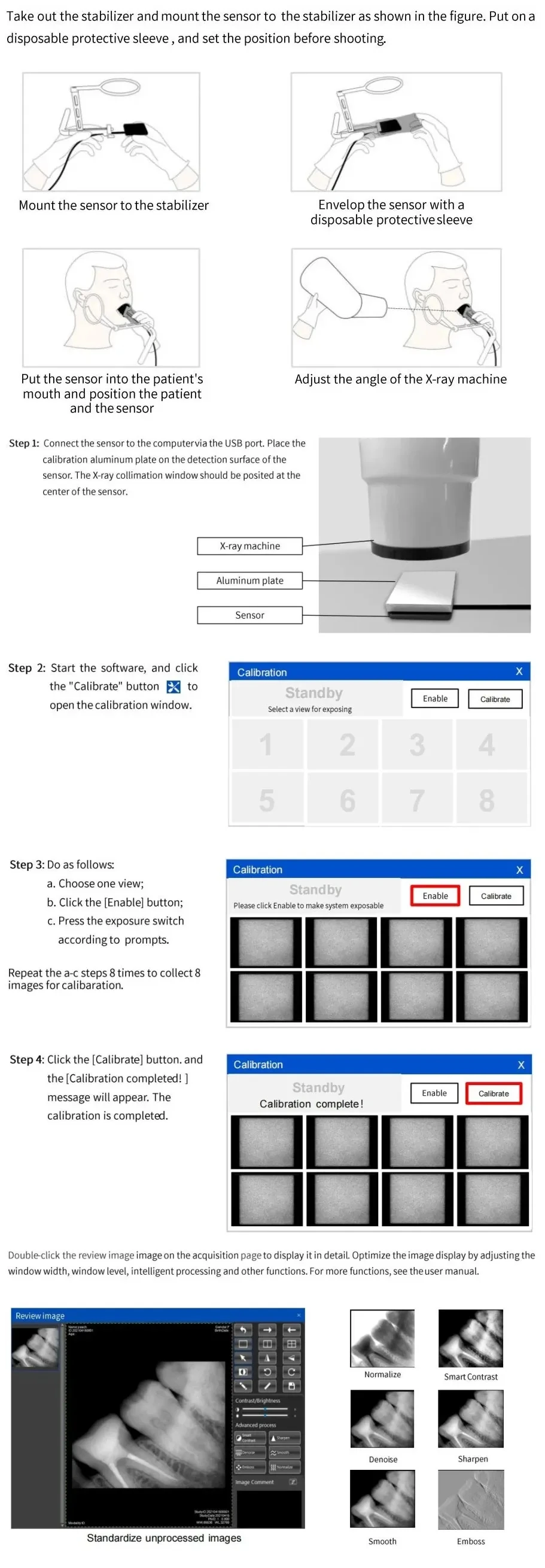The product is mainly composed of a sensor, an adaptor, a USB connection cable and workstation software. Working together with an X-ray equipment, the Product is intended to make X-ray radiography in dental clinics,sensor size Suitable for adult and child.