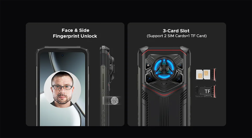 Face & Side Fingerprint Unlock / 3-Card Slot (Support 2 SlM Cards+1 TF Card)