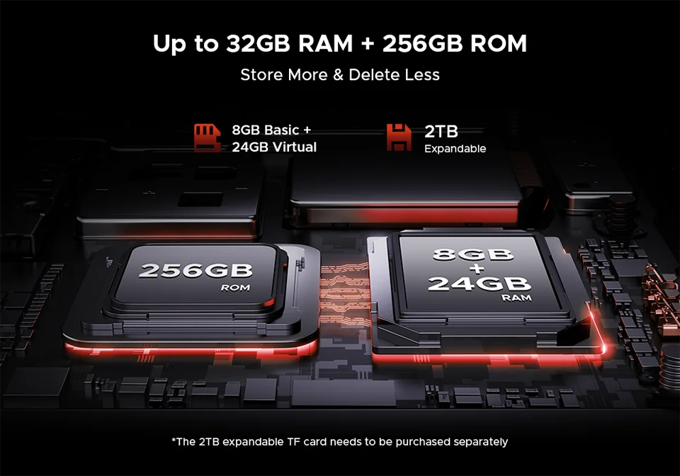 32GB RAM (8GB + Up to 24 GB Extended RAM) / LPDDR5 + 256GB ROM |