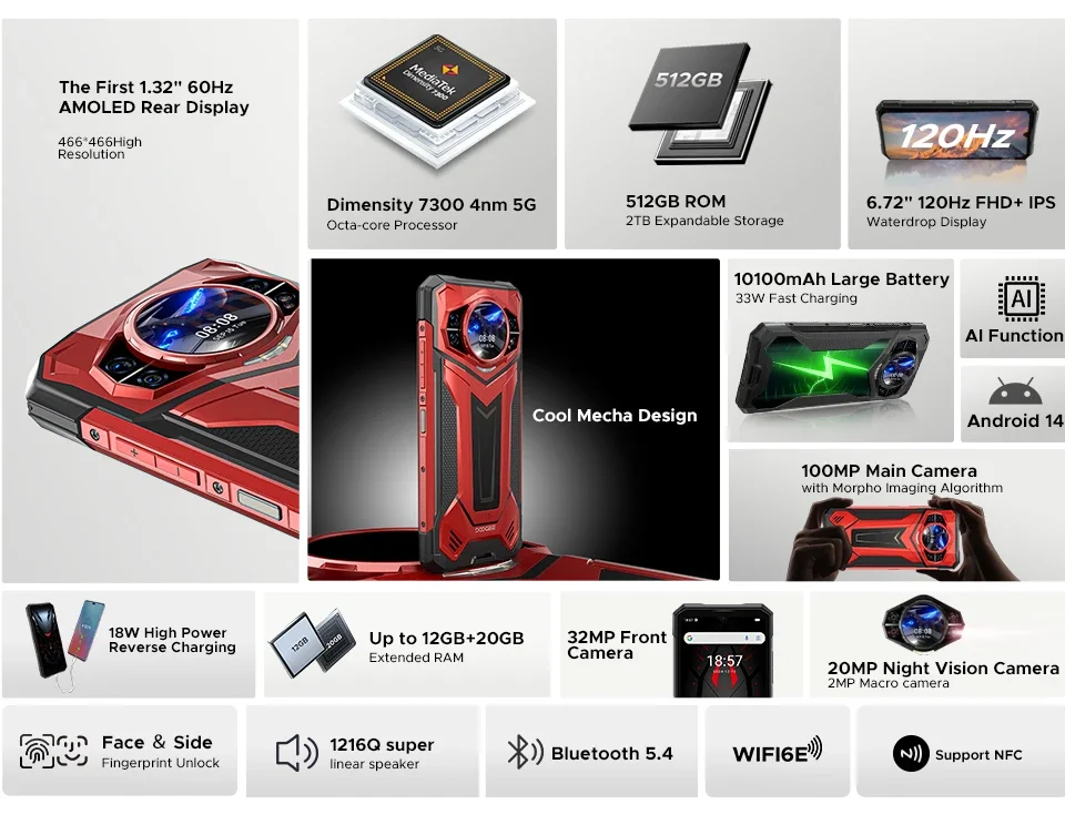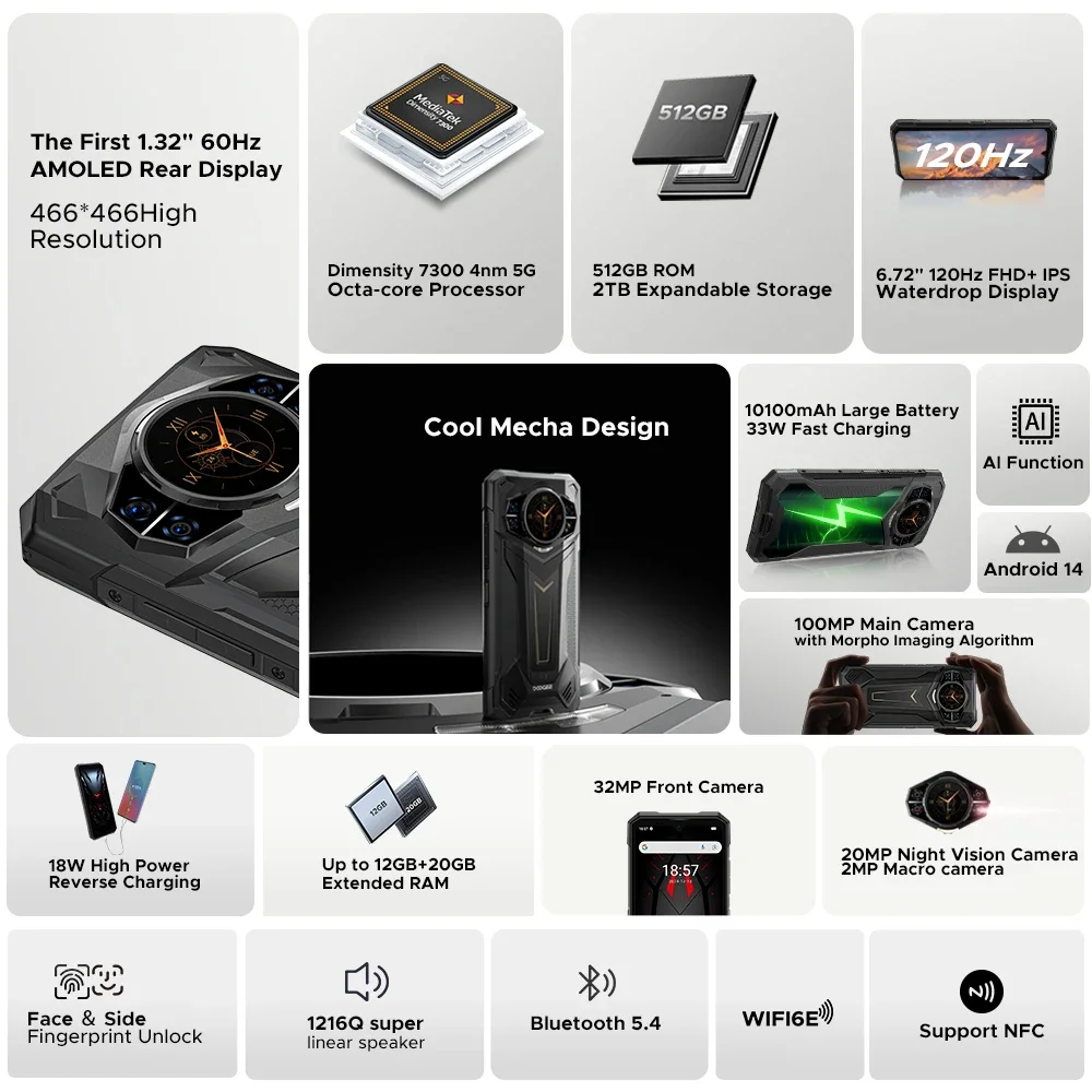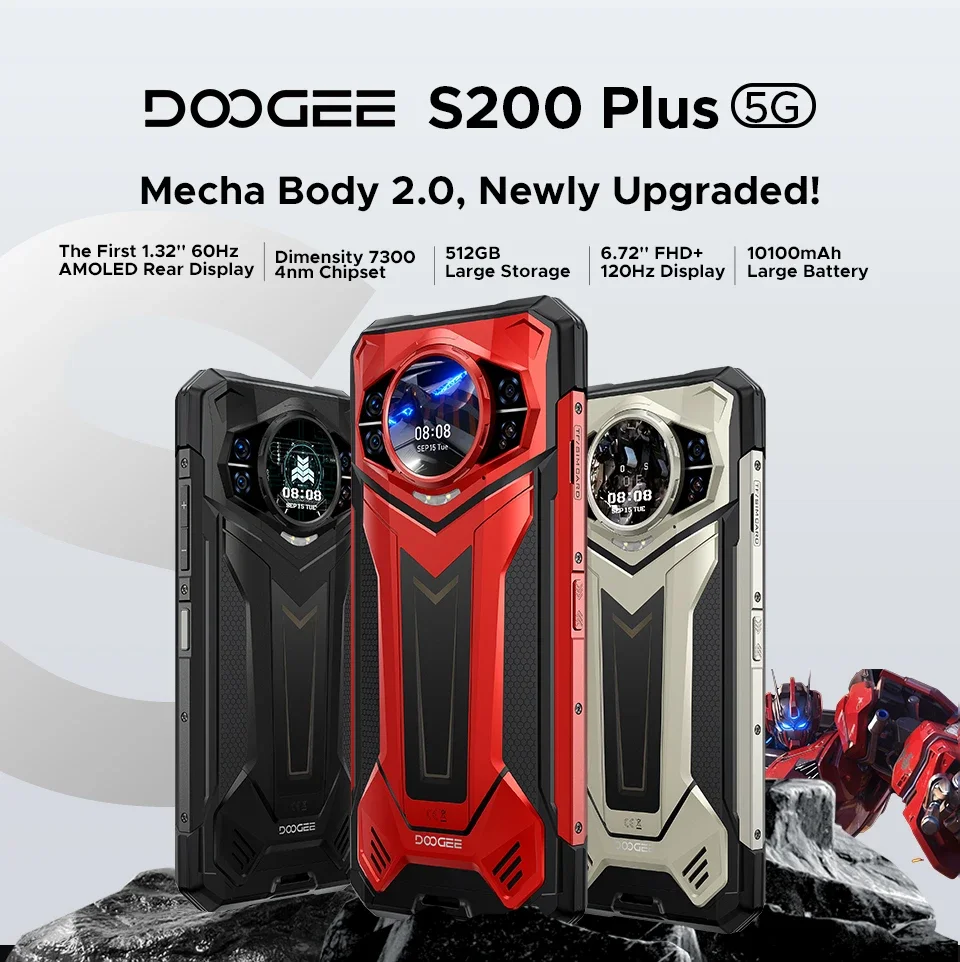 World Premiere DOOGEE S200 Plus 5G AI Rugged Phone Dimensity 7300 1.32″ Rear Display 12+512GB 6.72” 10100mAh Battery Smartphone