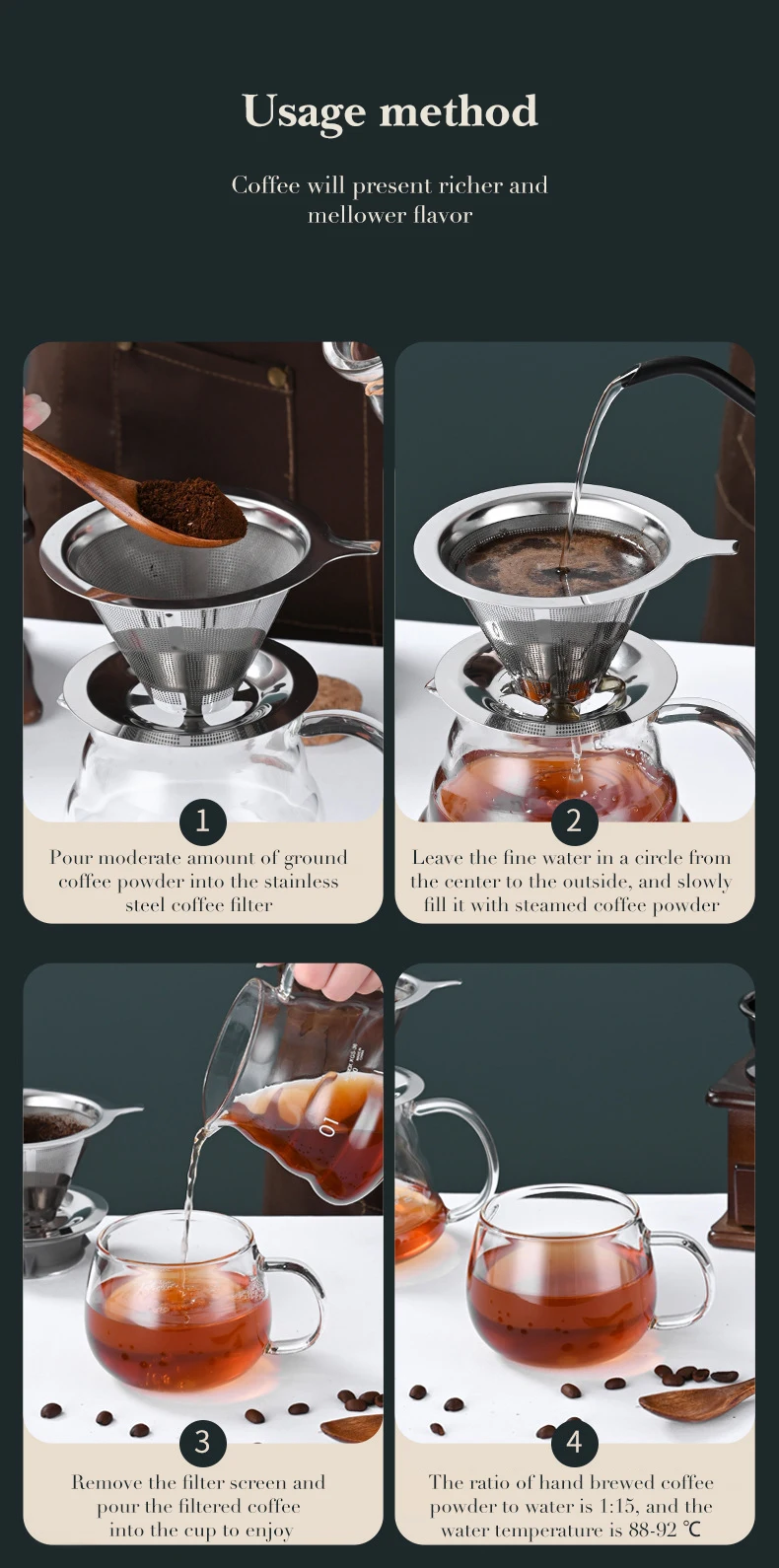 • [Paperless and Reusable] – Paperless and reusable coffee filters stay environmental friendly. Using a stainless steel pour over coffee drip tip not only helps to protect the environment by reducing filter paper waste, it also saves time and money in costs.