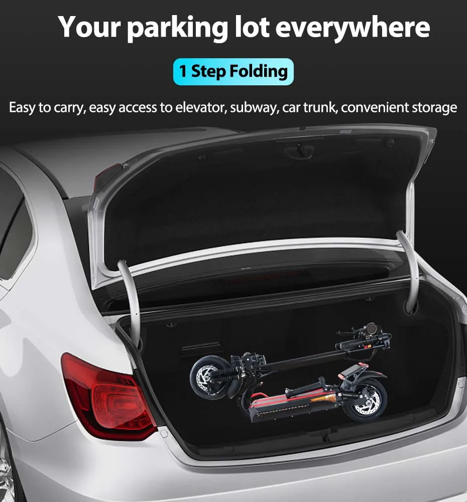 Foldable design is one of the highlights of X500 electric scooter. After folding, it can be placed in the trunk, suitable for travel and commute. The folded size is 44x9x16inch, the weight is 54LBS.