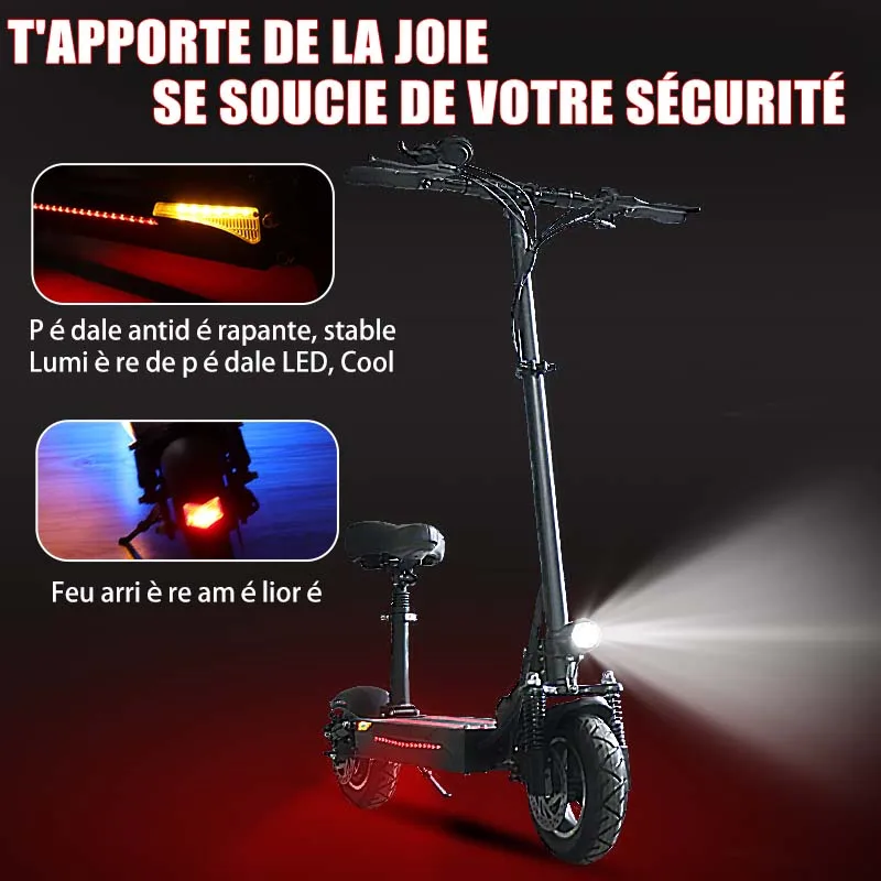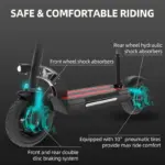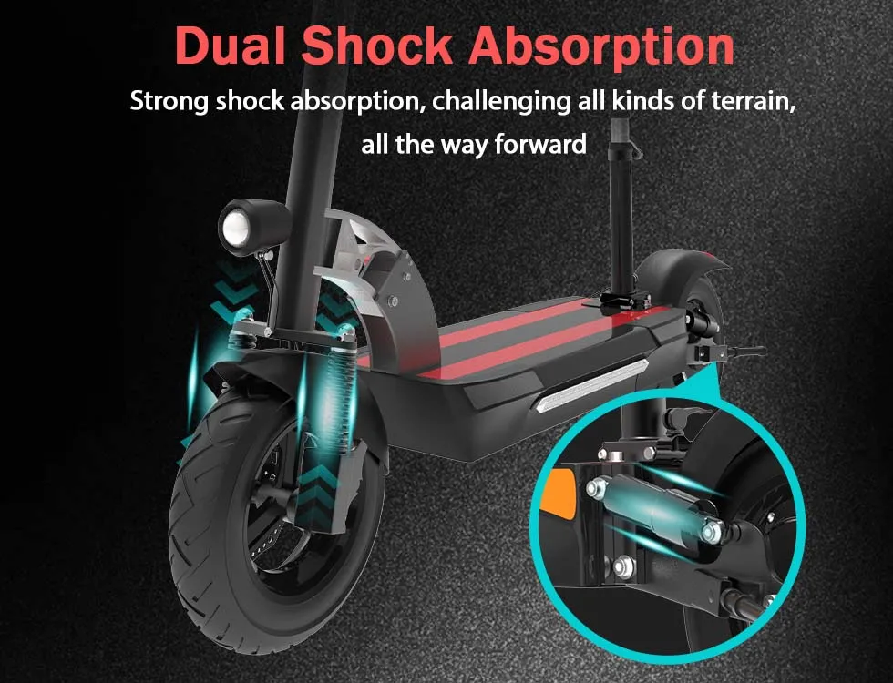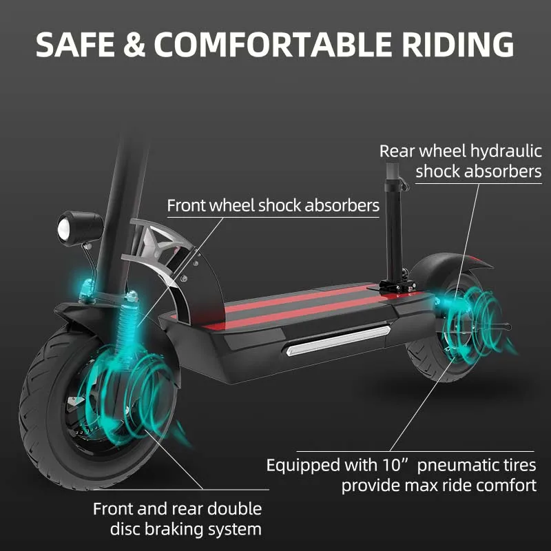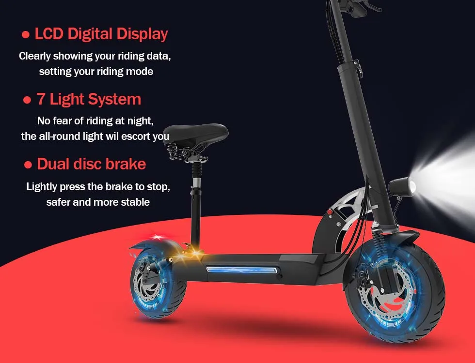 The 10-inch pneumatic tire can conquer all kinds of terrain. It can easily climb small hills up to 35°. The comprehensive disc brake system reduces the braking distance and ensures your safety in case of emergency. It comes with a removable seat for a more comfortable ride.