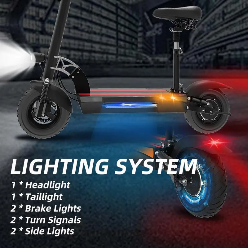 The electric scooter comes with a front light, which let you see the road condition more clearly. Two red brake lights and turn signal alert pedestrians and vehicles next to you. The side lights on both side of the pedals change colors to make it look even more cool.
