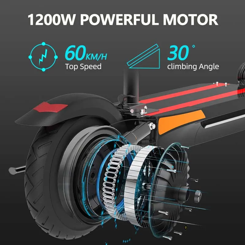 1200w rear motor helps electric scooter reach 60km/h max speed. With 13ah 48v lithium battery, it can travel up to 55-60km on single charge.