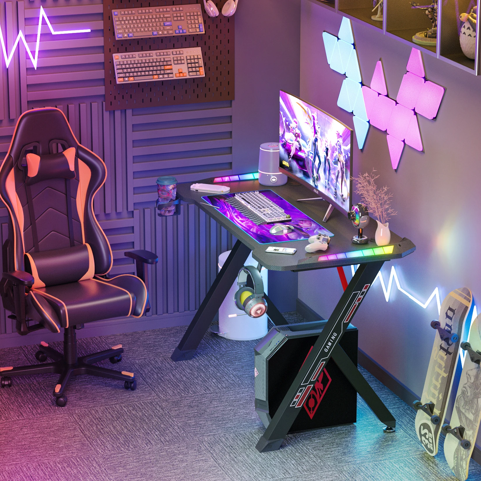 Dynamic RGB LED Lights Gaming Desk Sturdy PC Desk with Stable Thickened Metal Legs 3D Carbon Fibre Surface