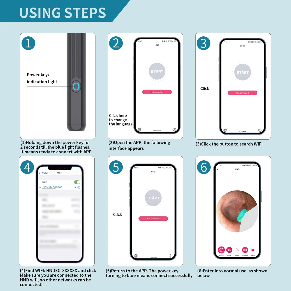 【Easy to Use & Wide Compatibility 】 Scan QR code on manual ,Download and install the APP on your device, Press and hold the power button on top of device to turn on the ear cleaning rod and then connect WiFi(Name :HNDEC-xxxx) with your device .The APP works with all of Android smartphone / tablet and IOS iPhone / iPad.
