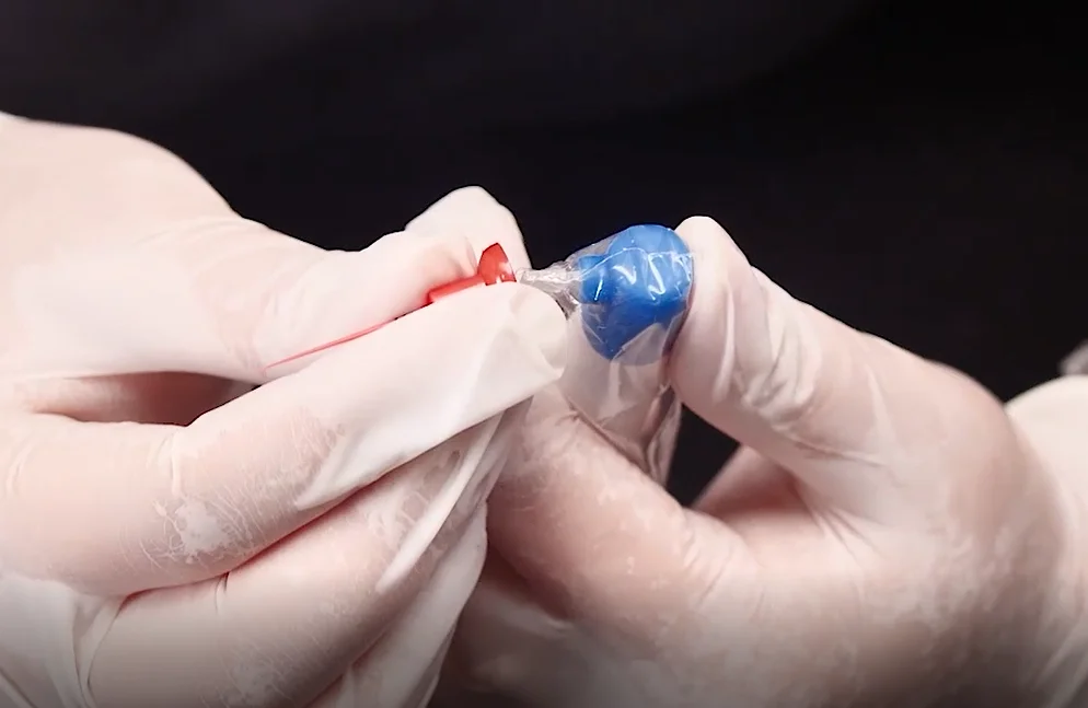 5) Connect the needle tip to the hand device with the barrier sleeve. The activator should snap on firmly, promoting a secure connection with the hand device.