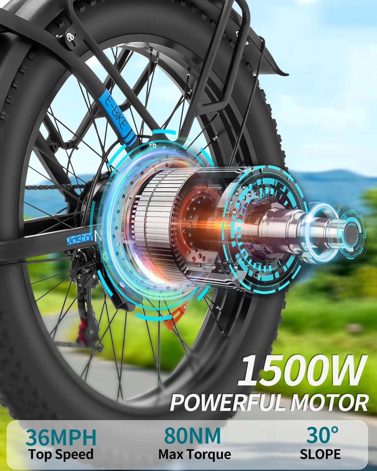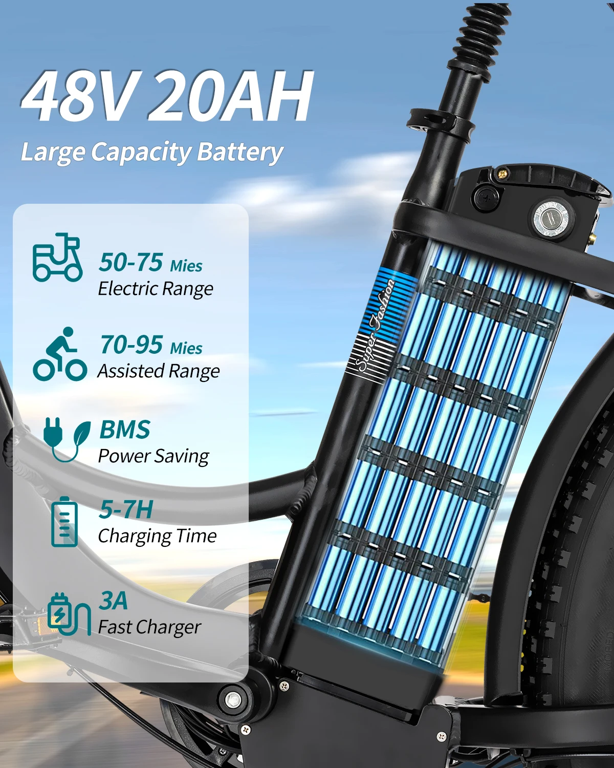 The Ridstar MN-26 ebike boasts a 1500W motor for effortlessly conquering 30-degree slopes. It comes with a removable 48V20Ah battery(with UL& BMS system) that provides an impressive range of up to 60-70 miles on a single charge. The waterproof and removable battery design allows for convenient installation and minimizes the risk of theft.