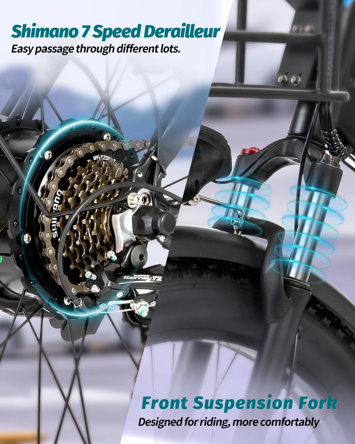 The upgraded 26×4” wide puncture-resistant fat tires provide superior performance and a sleek look. Experience a smooth ride with adjustable front suspension and seatpost. Stay in control with dual disc brakes and enjoy precise shifting with the Shamano 7-gear system. Stay safe with a bell, bright LED headlight, and brake light, even during nighttime rides.