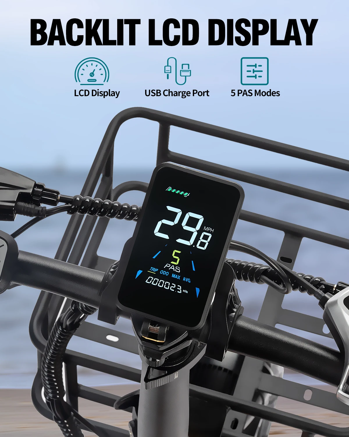 The Ridstar MN-26 features three modes: pure electric, assisted bicycle, and normal bike. Opt for assisted mode for long-distance travel with exercise. Customize your ride with five-speed settings. The LCD color display provides important ride information like speed, battery level, and mileage. Stay connected with the built-in USB port for phone charging on the go, anytime, anywhere.