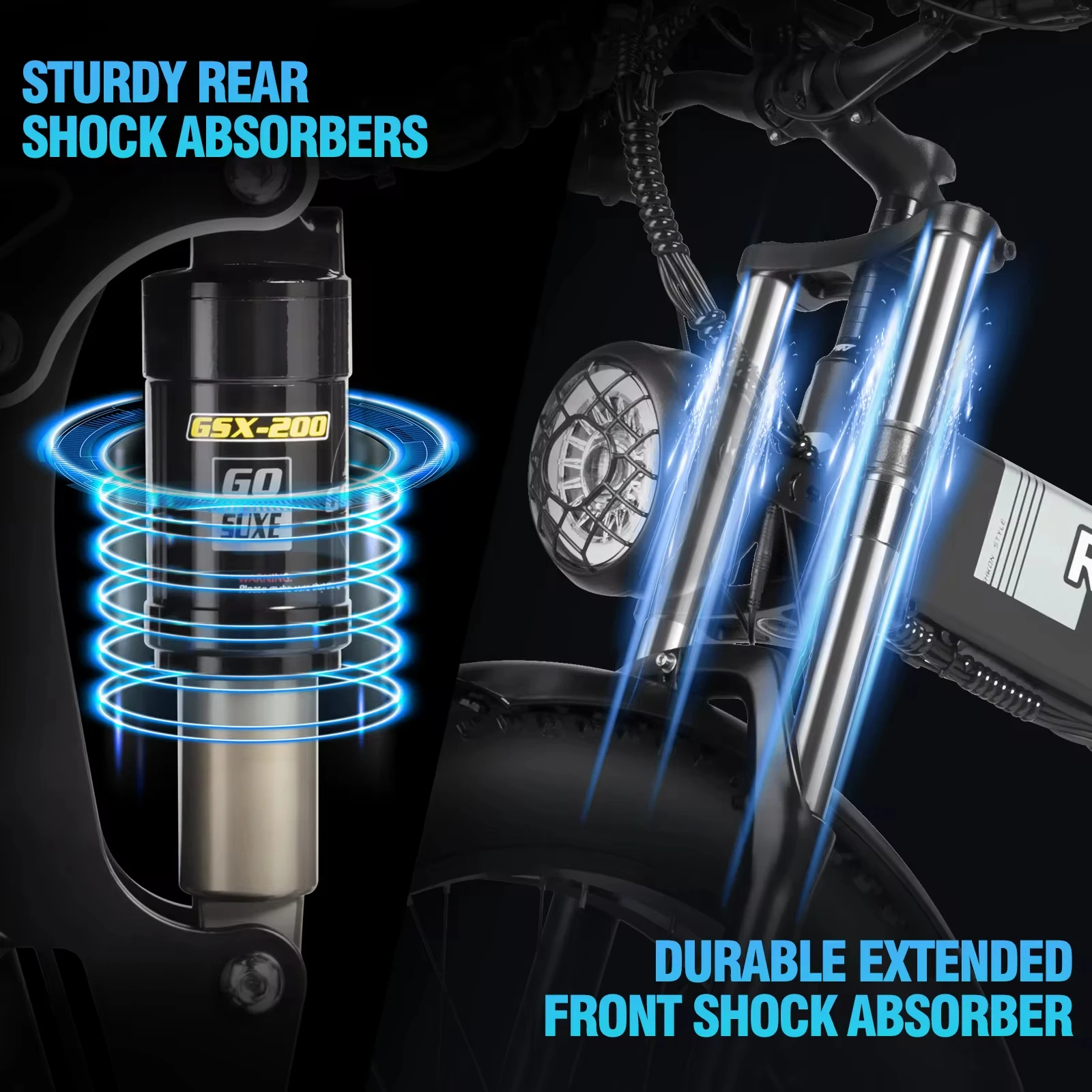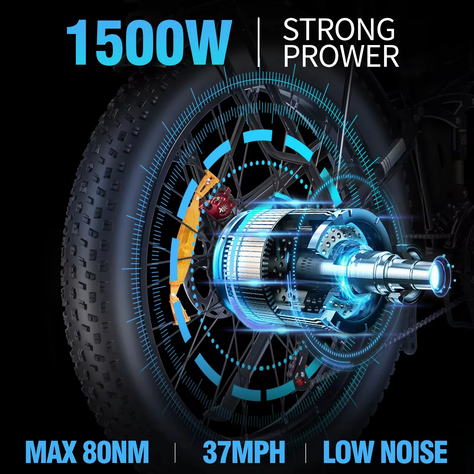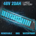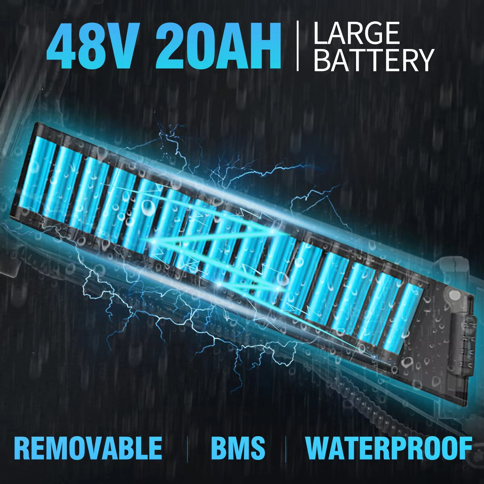The Ridstar MN-26 ebike boasts a 1500W motor for effortlessly conquering 30-degree slopes. It comes with a removable 48V20Ah battery(with UL& BMS system) that provides an impressive range of up to 60-70 miles on a single charge. The waterproof and removable battery design allows for convenient installation and minimizes the risk of theft.