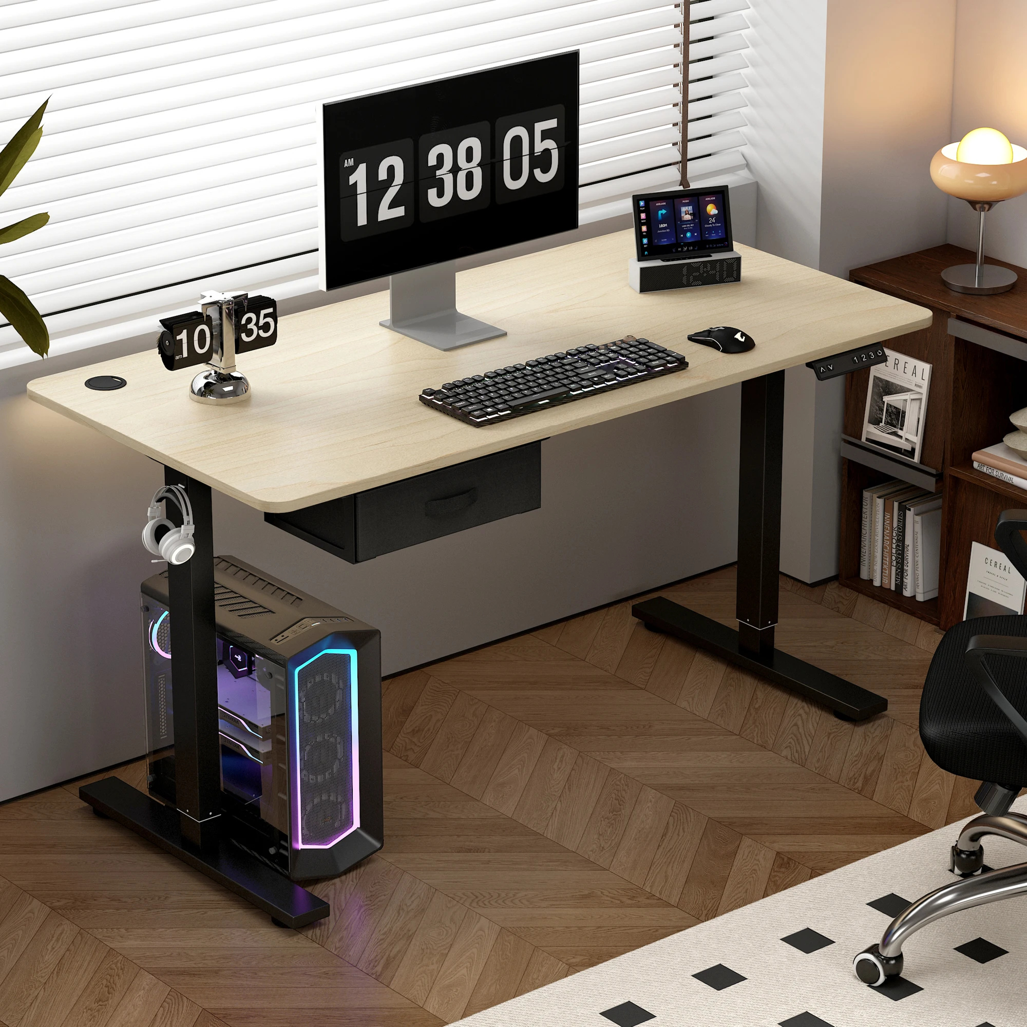 Elevate Your Workspace with the Height Adjustable Electric Standing Desk complete with USB A Charger point. Stop slouching and start moving throughout your workday with this versatile height adjustable standing desk. This electric standing desk makes it easy to alternate between sitting and standing throughout the day, engaging your muscles, boosting energy levels, and improving your health and productivity. The three programmable buttons allow you to save your ideal seated and standing heights, making it a breeze to switch positions. The solid 1.5cm thick desktop comes as one solid piece which provides superior stability for your devices and belongings (not like other sellers that divide the table top into 3-4 pieces which required more assembling). The built-in drawer keeps your most-used office essentials handy. And the USB-A charging port lets you power up phones and tablets right on your desktop surface. If you're looking for an easy, affordable way to incorporate more movement into your daily routine, this height adjustable electric standing desk is the perfect solution. The customizable height settings accommodate children and adults of all sizes comfortably. Upgrade your workstation with this versatile electric standing desk!