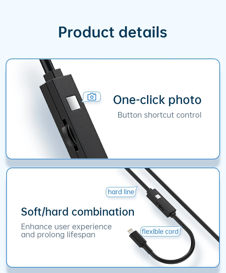 • Plug-and-play :The endoscope camera is easy to use and can be plugged in ios phone directly without any complicated setup processes.