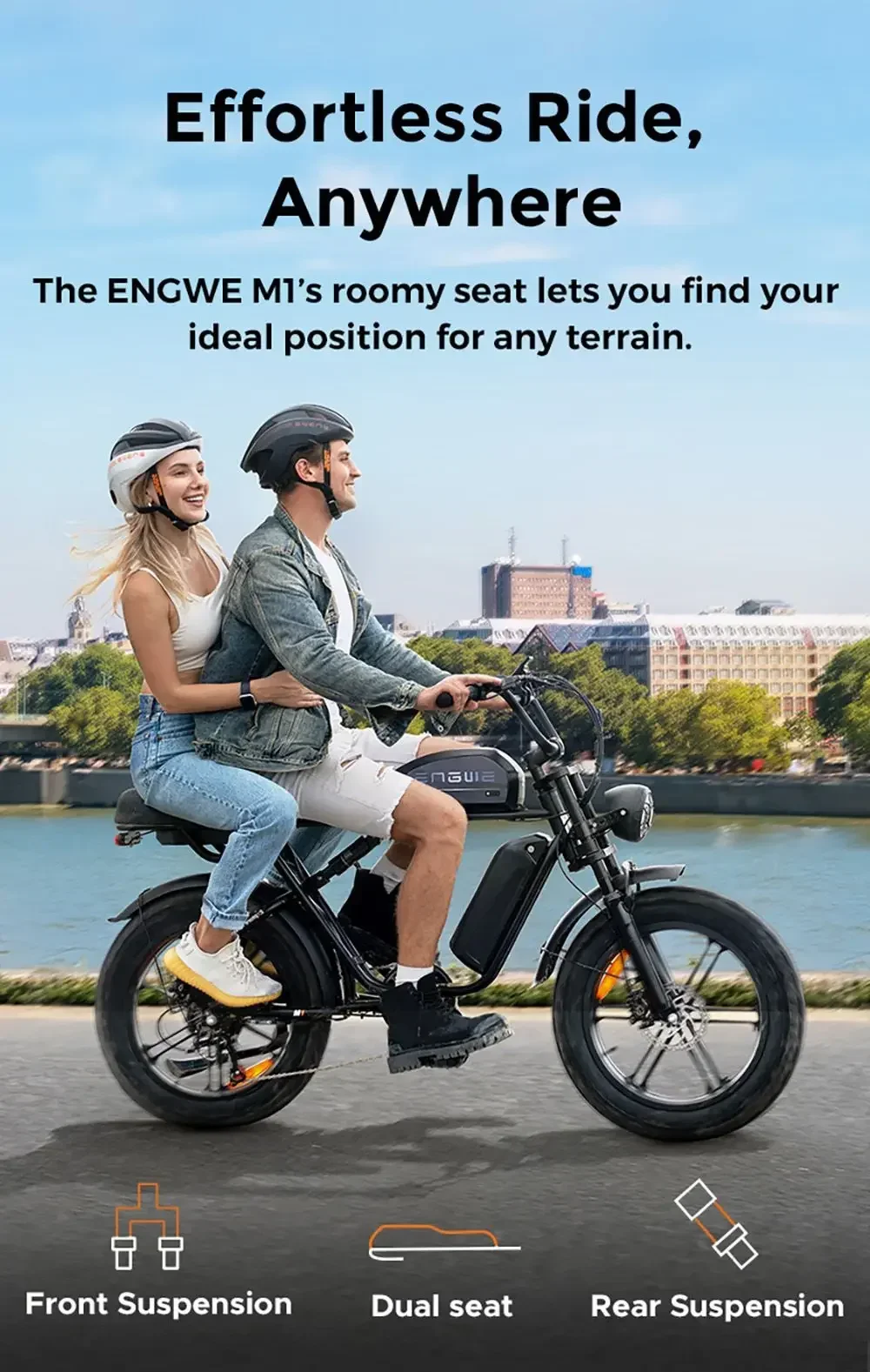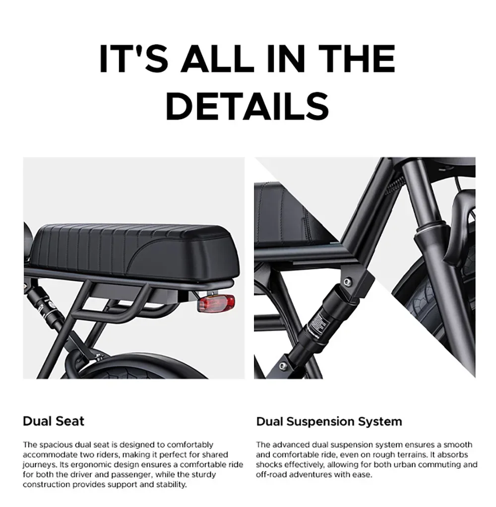 The advanced dual suspension system ensures a smooth and comfortable ride, even on rough terrains. It absorbs shocks effectively, allowing for both urban commuting and off-road adventures with ease.