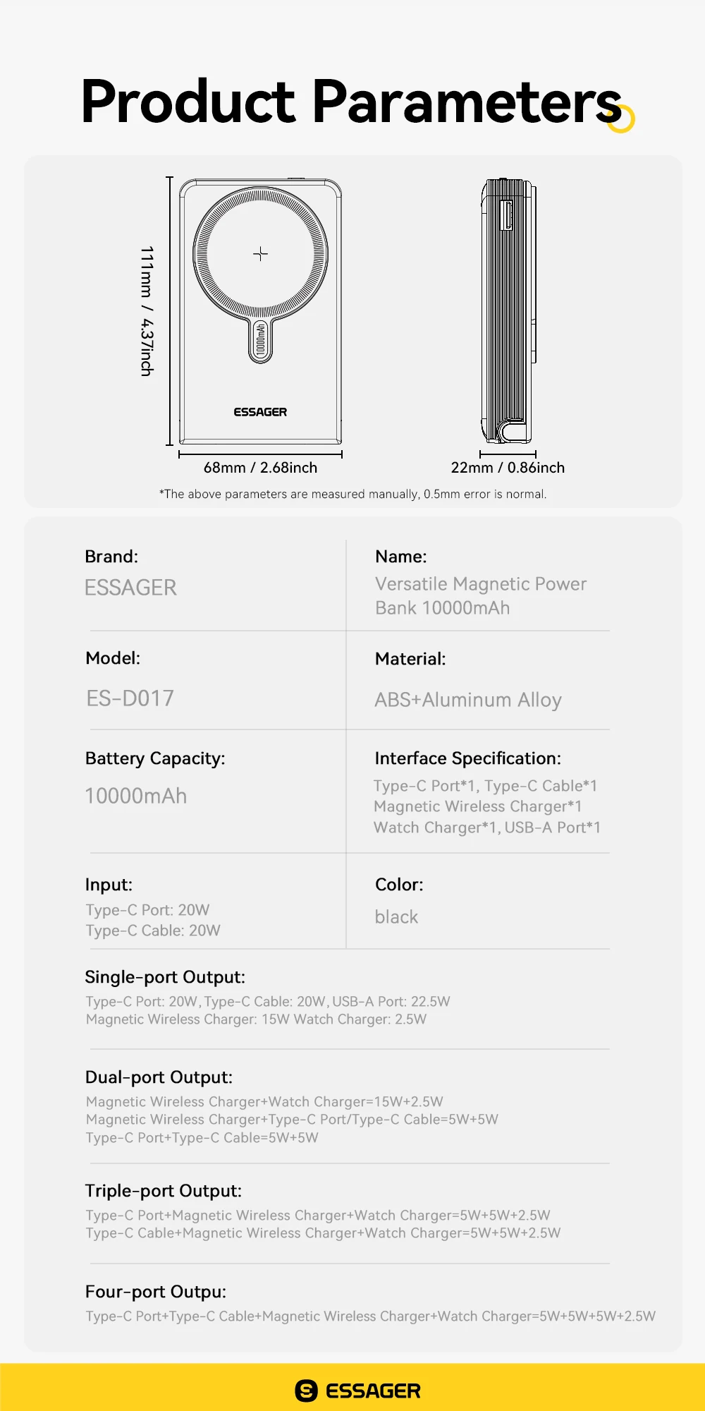 - Single-port Output: Type-C Port: 20W,Type-C Cable: 20W,USB-A Port: 22.5W,Magnetic Wireless Charger: 15W Watch Charger: 2.5W
