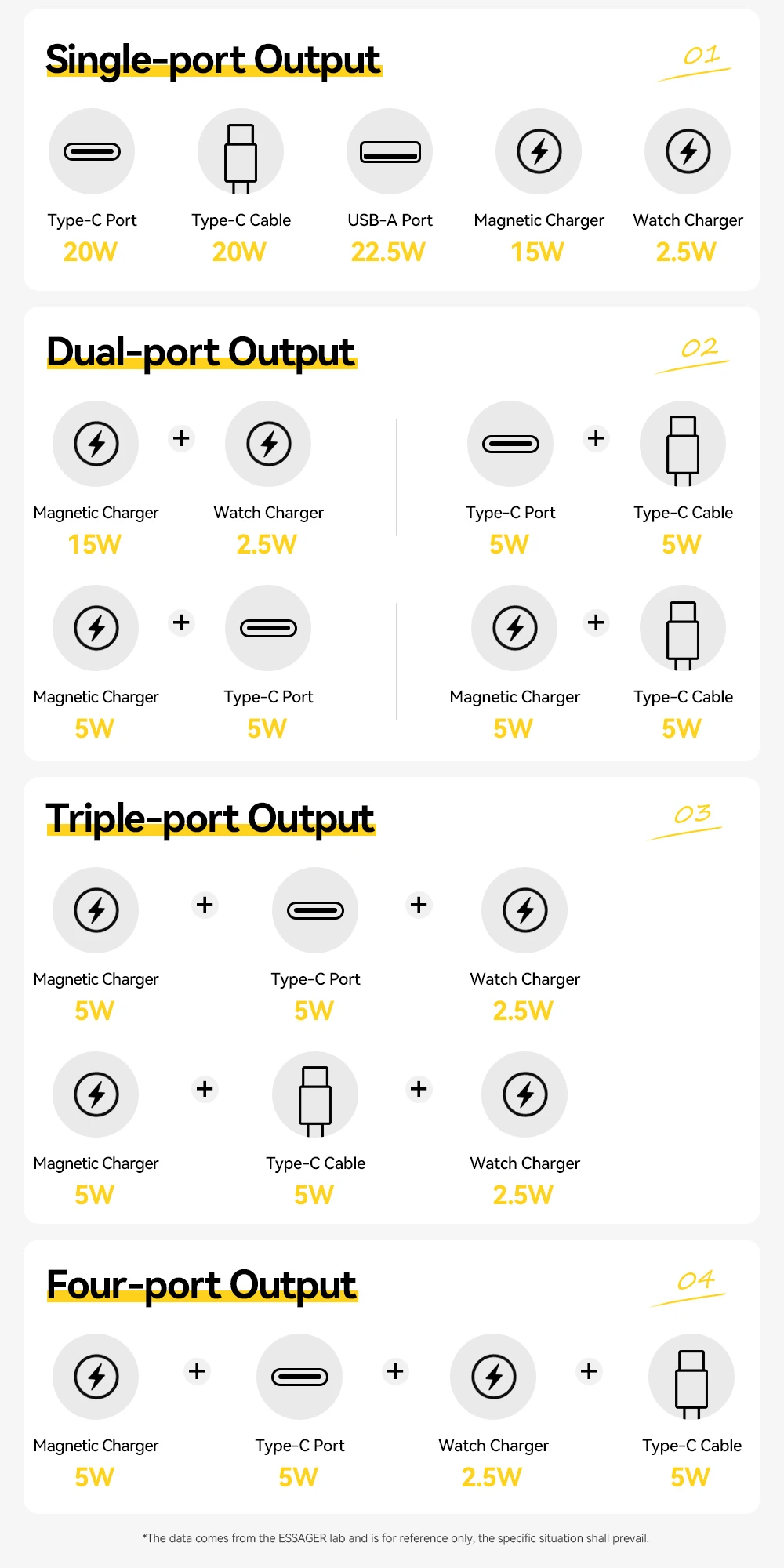 • Single-port Output: Type-C Port: 20W,Type-C Cable: 20W,USB-A Port: 22.5W,Magnetic Wireless Charger: 15W Watch Charger: 2.5W