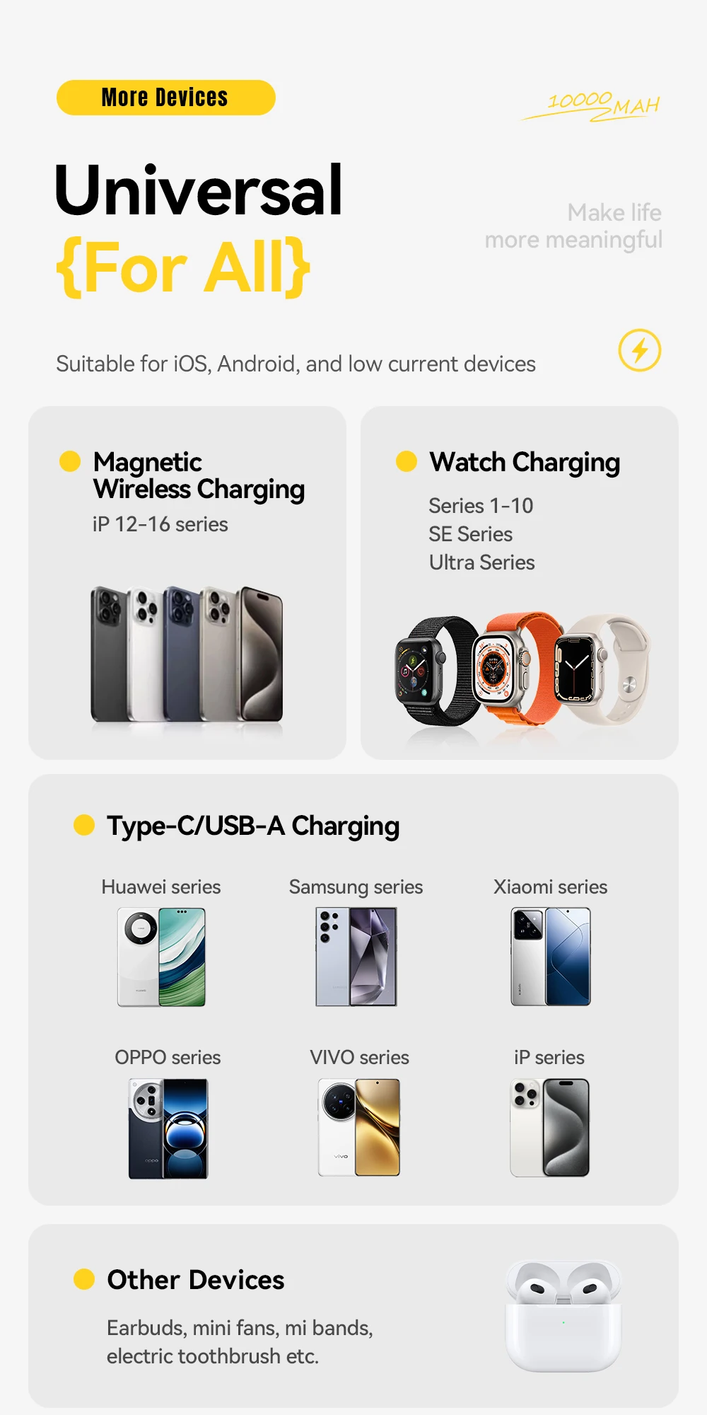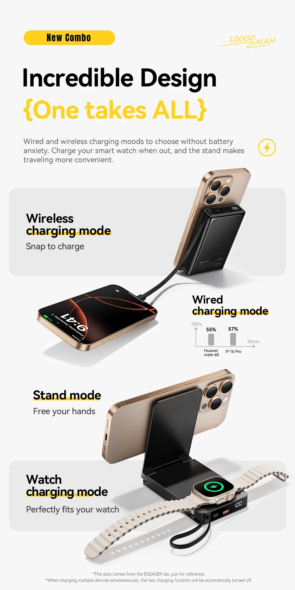 • Triple-port Output: Type-C Port+Magnetic Wireless Charger+Watch Charger=5W+5W+2.5W,Type-C Cable+Magnetic Wireless Charger+Watch Charger=5W+5W+2.5W