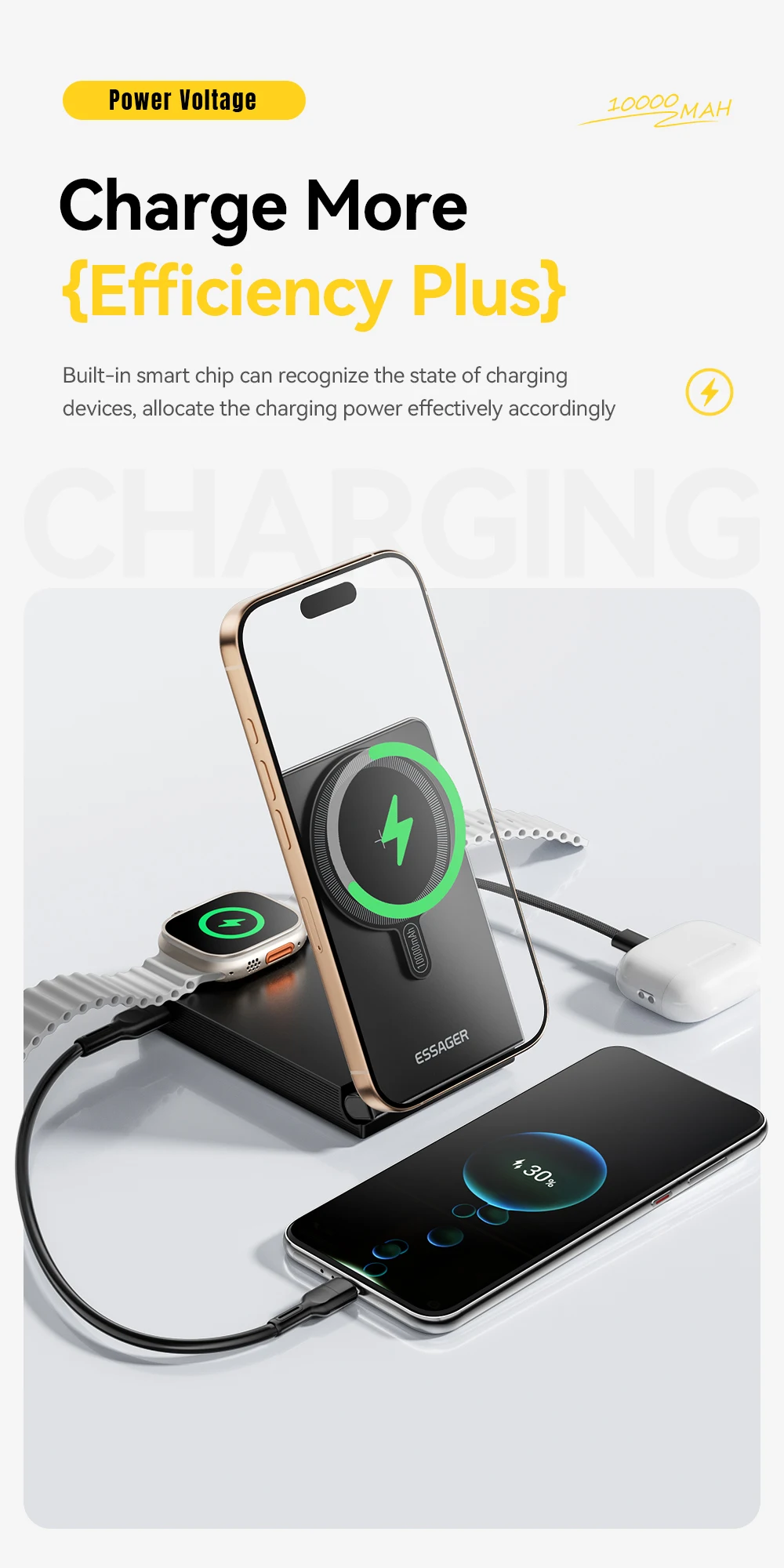 • Dual-port Output: Magnetic Wireless Charger+Watch Charger=15W+2.5W,Magnetic Wireless Charger+Type-C Port/Type-C Cable=5W+5W,Type-C Port+Type-C Cable=5W+5W