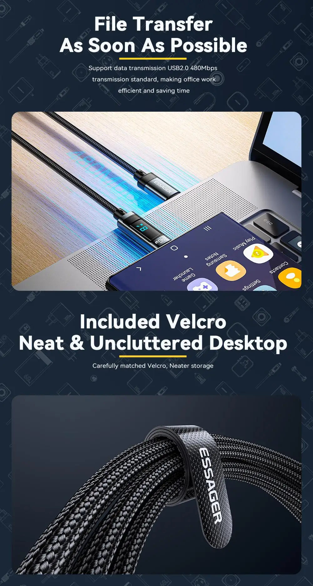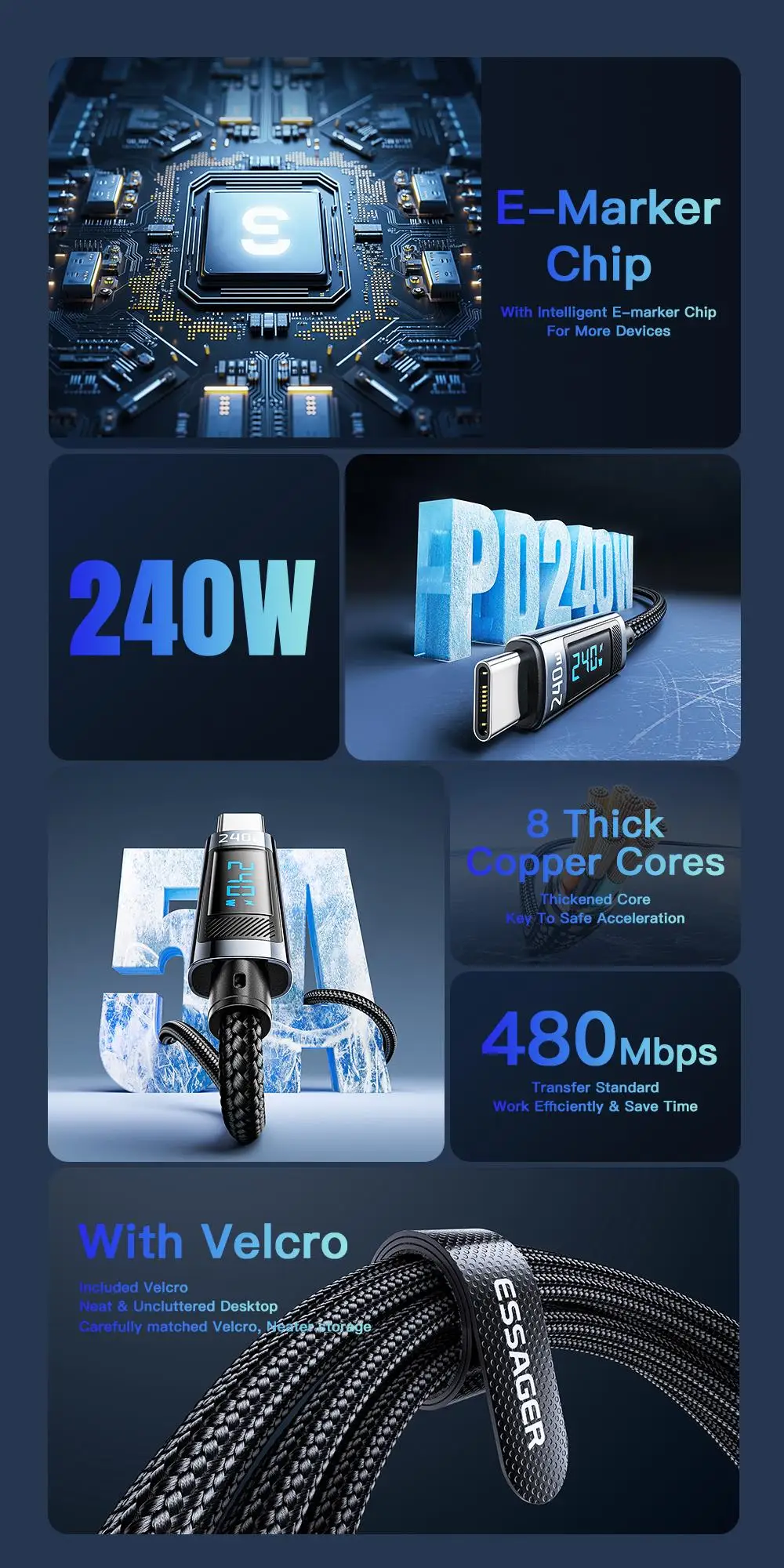 Essager USB C to USB Type C cable supports 240W/ 100W/ 30W fast charging and can be used to charge laptops/tablets/mobile phones.