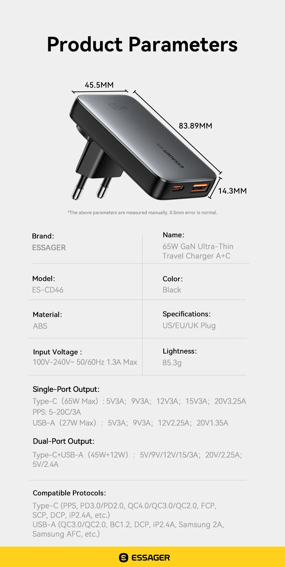 Be the first to review “ESSAGER 65W GaN Charger PD Charge Type C USB Charger Support QC PPS Portable Fast Charger For iPhone 16 15 14 13 Laptop Charger”