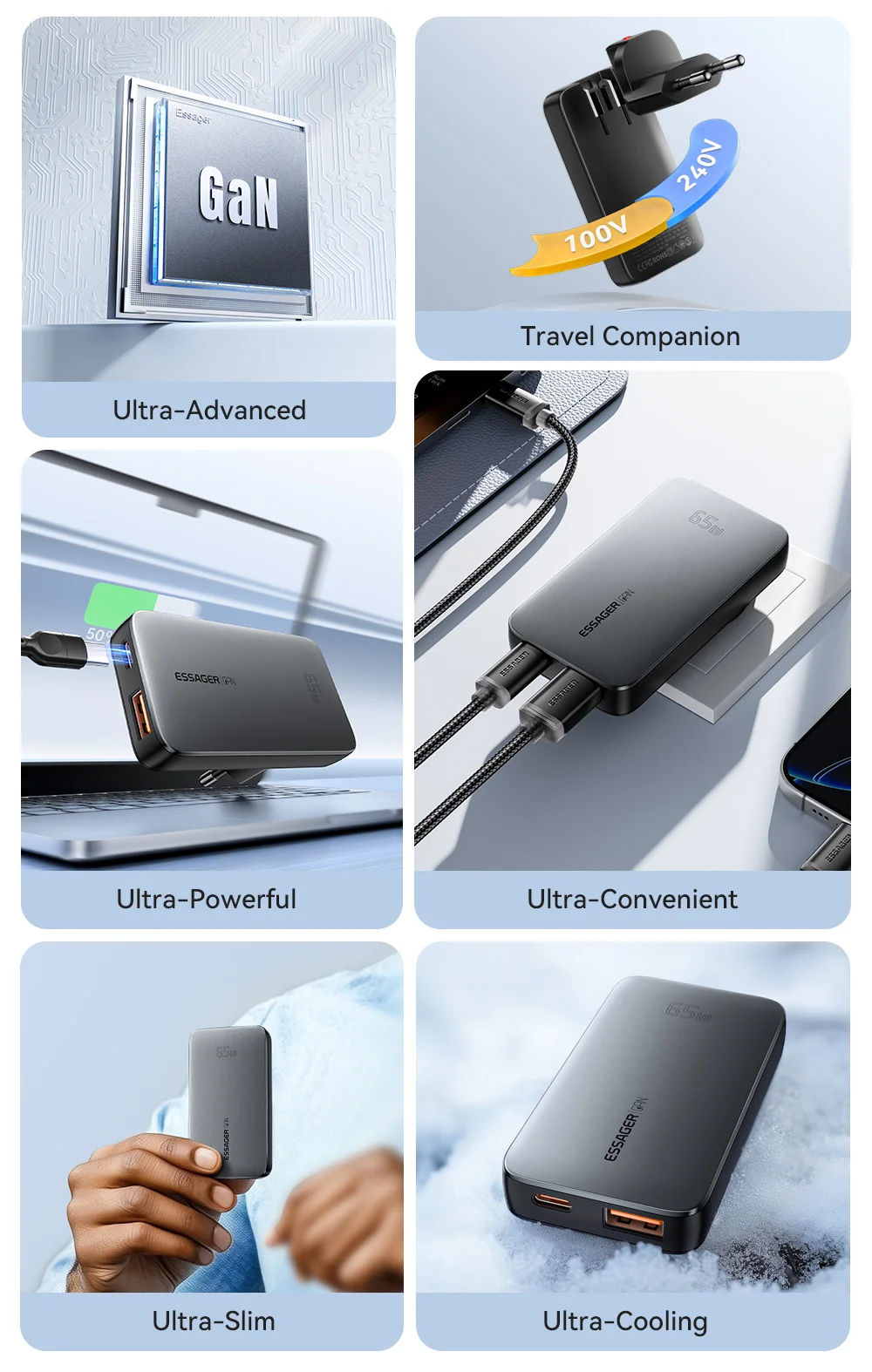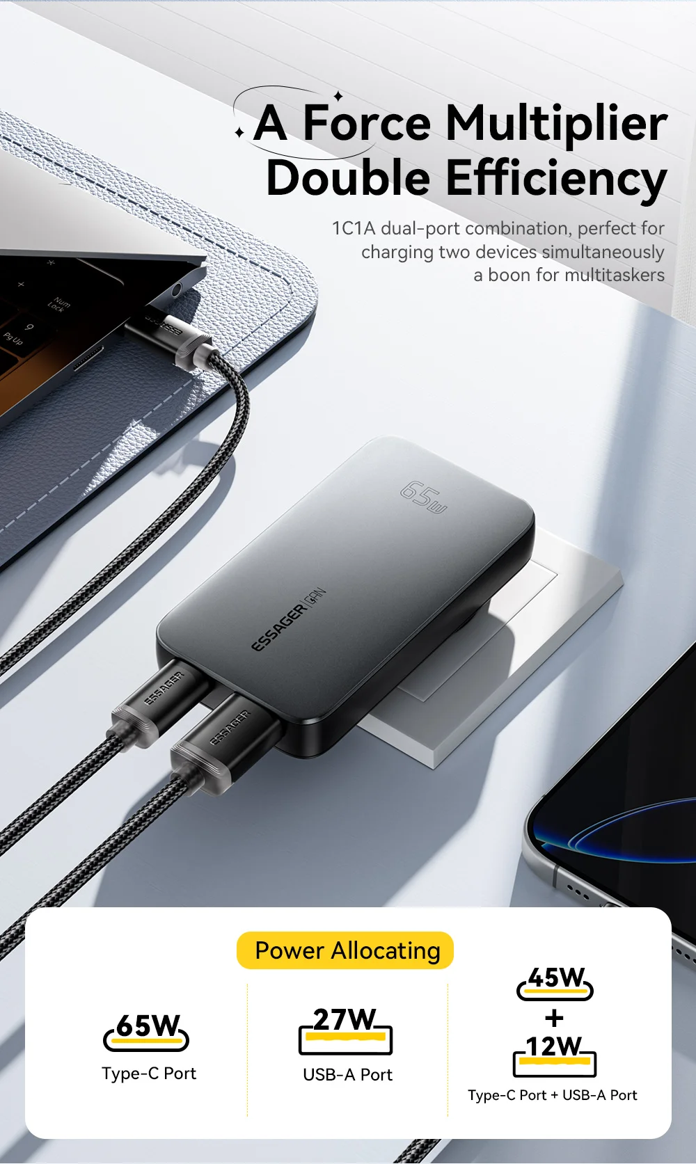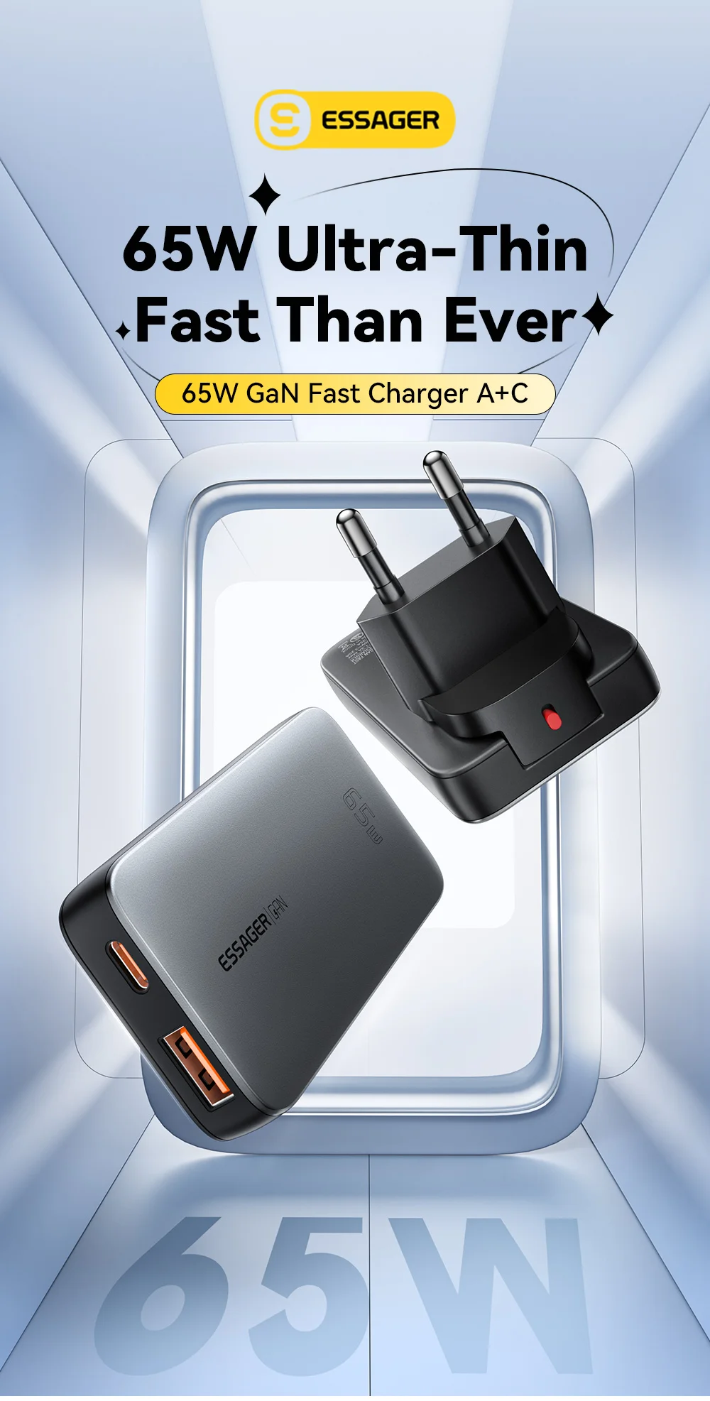 ESSAGER 65W GaN Charger PD Charge Type C USB Charger Support QC PPS Portable Fast Charger For iPhone 16 15 14 13 Laptop Charger