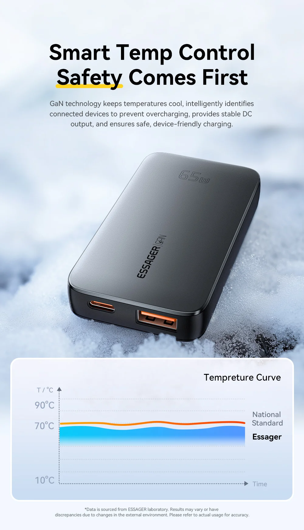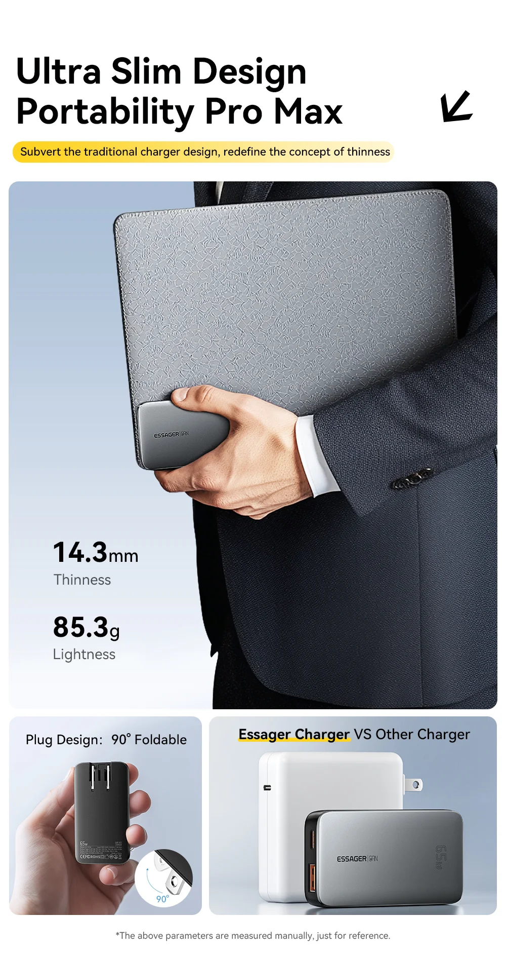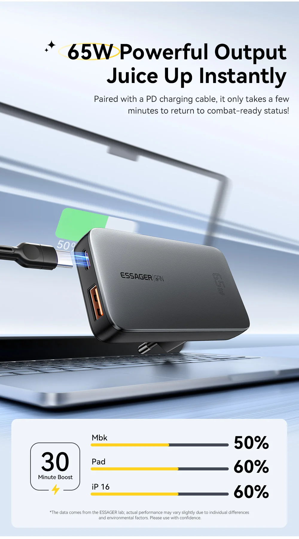 ESSAGER 65W GaN Charger PD Charge Type C USB Charger Support QC PPS Portable Fast Charger For iPhone 16 15 14 13 Laptop Charger