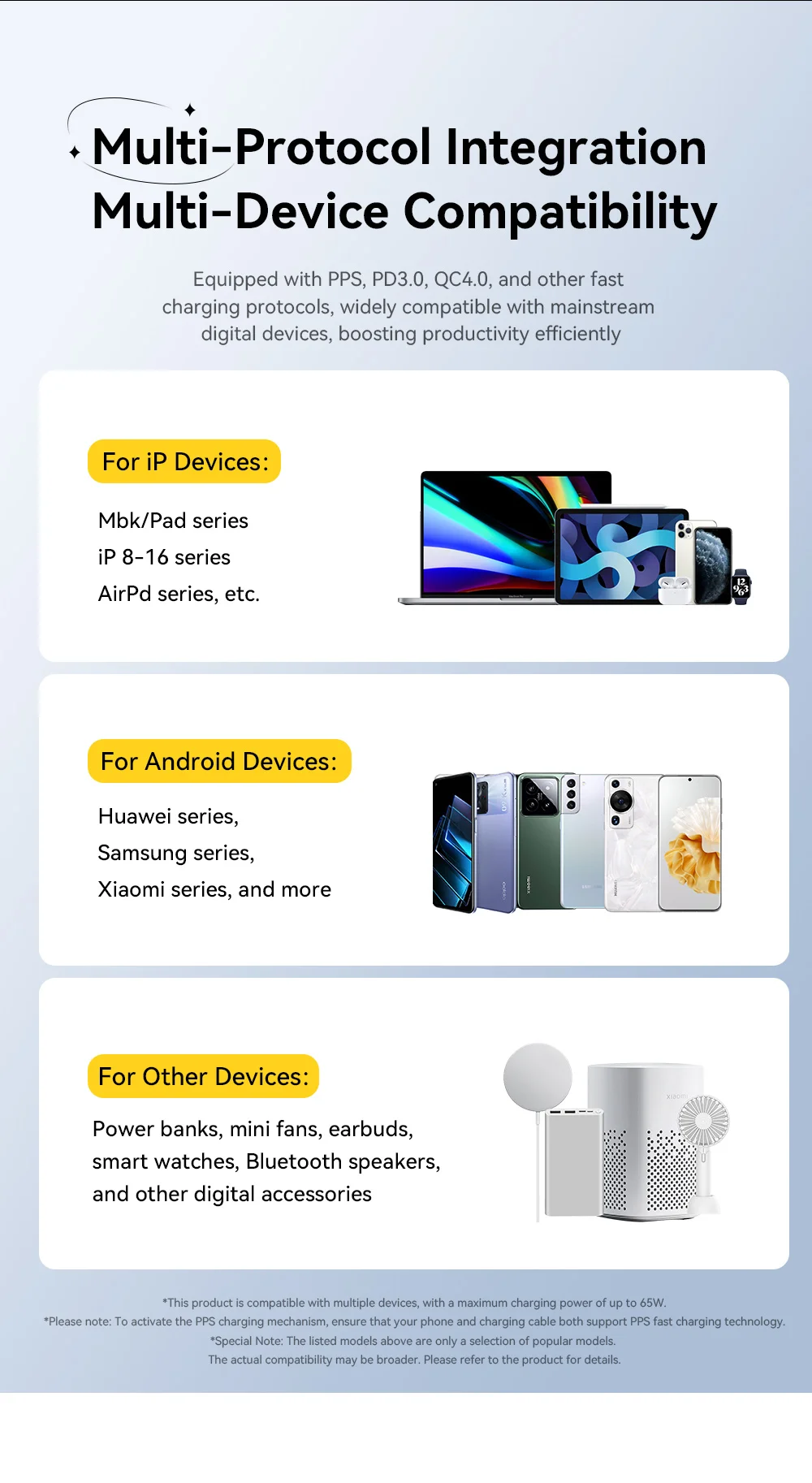 • Applied Fast Charge Protocols: Samsung Adaptive Fast Charge,Huawei FCP,USB PD,BC1.2,Qualcomm Quick Charge,Huawei Quick Charge