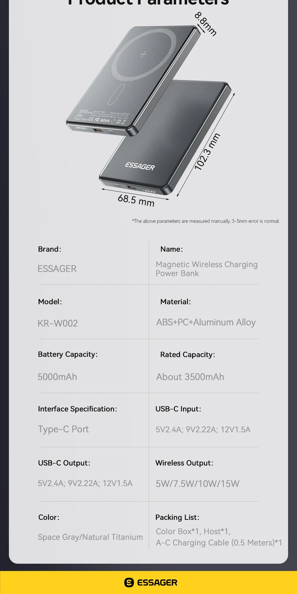 - Product: Essager 5000mAh Thin Wireless Power Bank