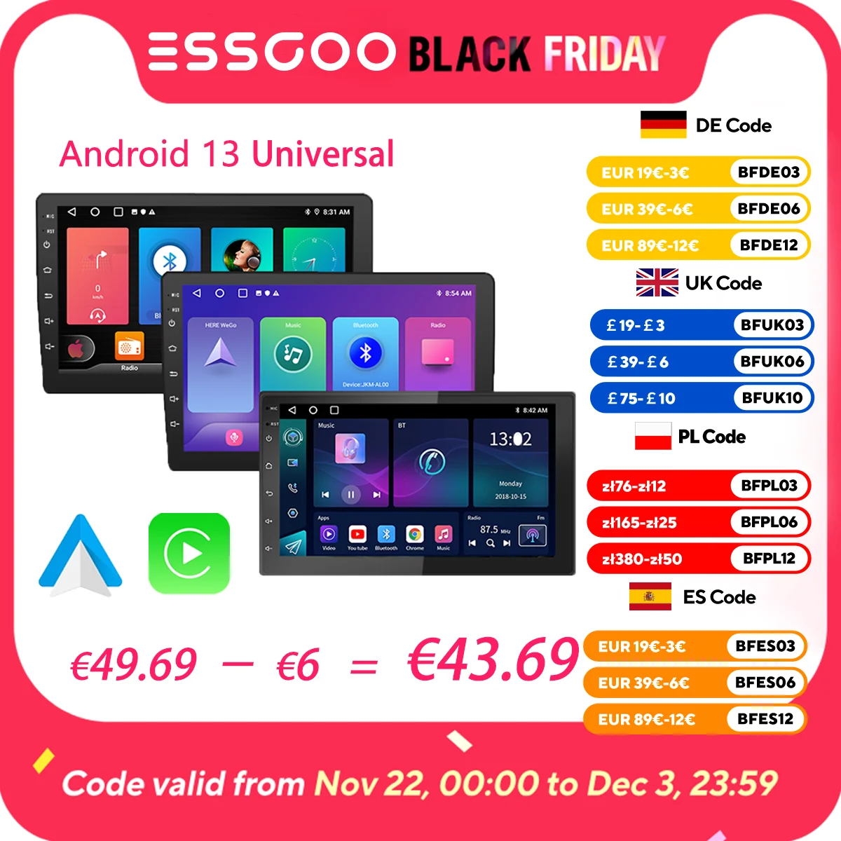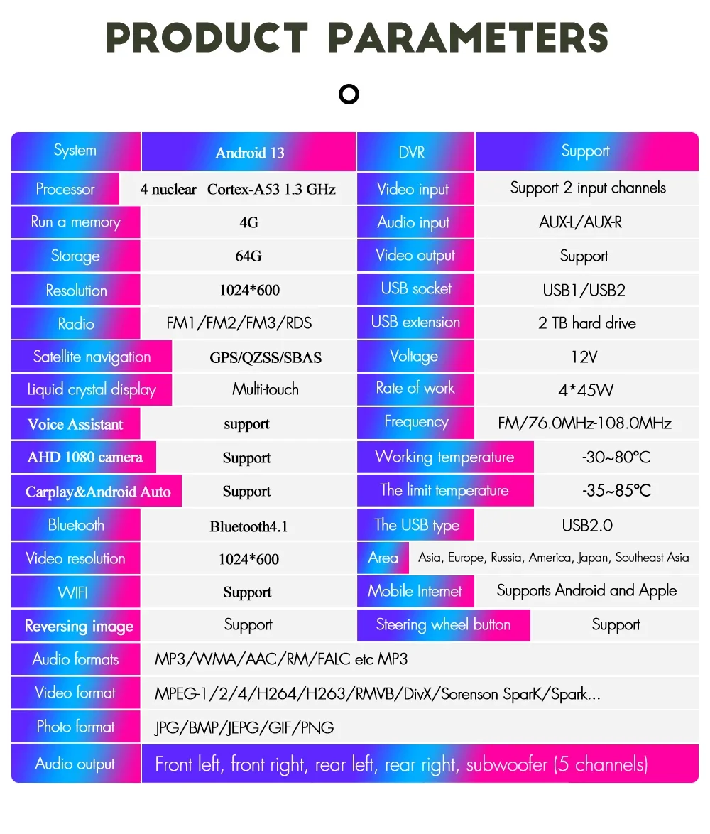 – ANDROID 13 SYSTEM,CPU 4 Core AC8227L  A53 , 4GB RAM + 32GB ROM / 4GB RAM + 64GB ROM