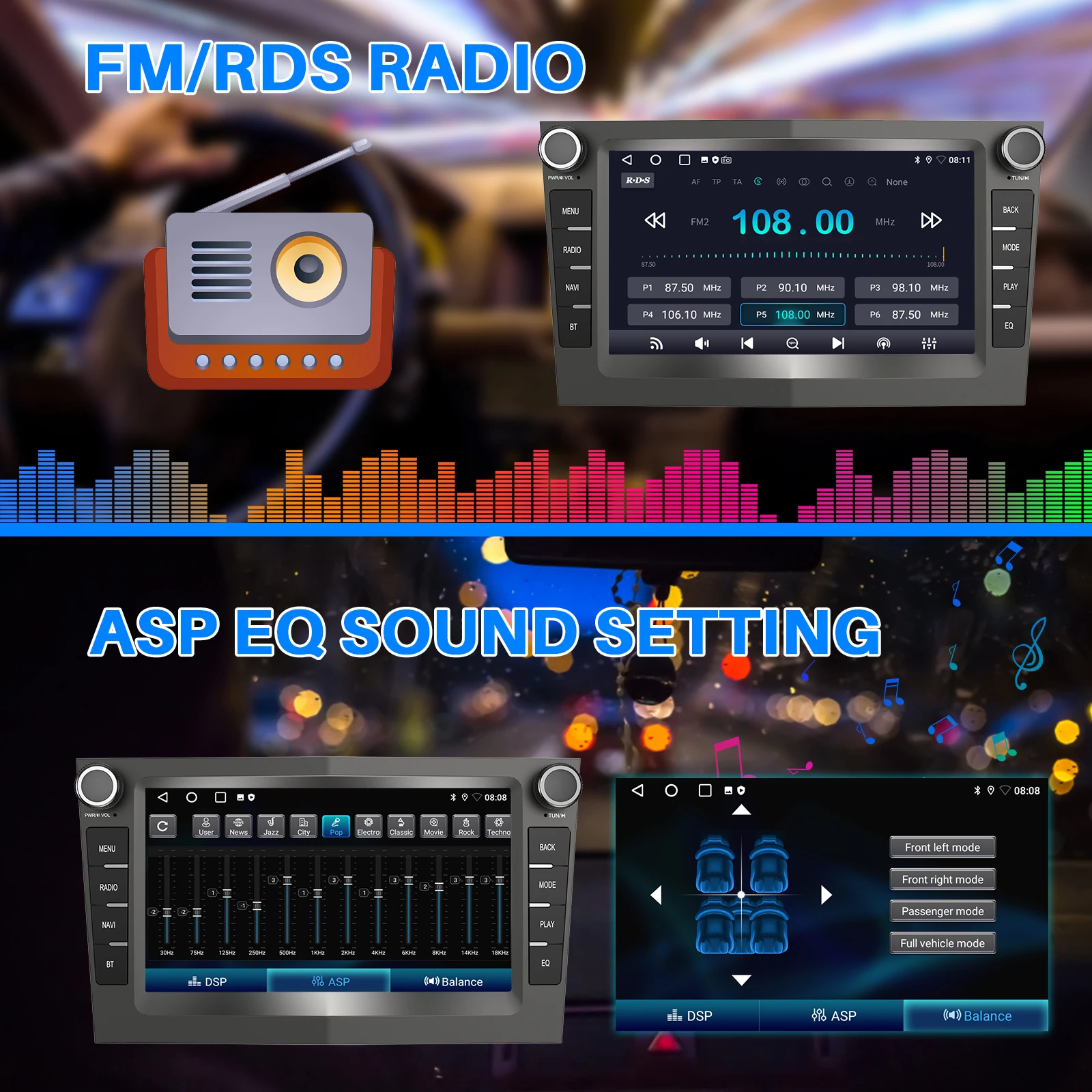 RDS/FM Radio and Bluetooth and ASP Sound: Supports Bluetooth 4.1, with built-in microphone so you can make hands-free calls while driving. Support access to phone book, music playback interface, etc. RDS supported. You can save 18 FM radio stations. Built-in ASP chip. Supports 32-band EQ setting, which can be adjusted according to your personal preference. Which is very similar to your original sound. 4 x 45W amplifier, surround sound and subwoofer output