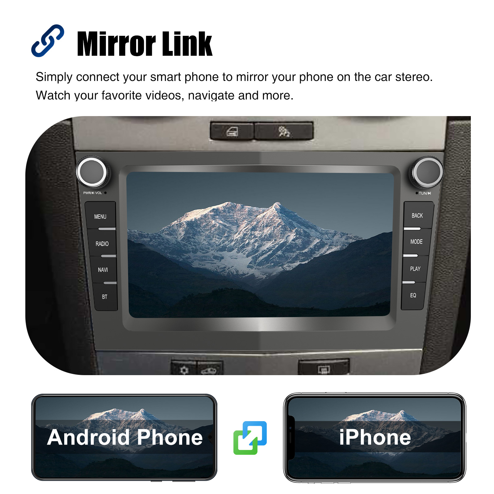 MIRROR LINK:Â With this car radio, you can experience the amazing Mirror Link function, compatible with iOS and Android phones. You can mirror your smartphone screen to the car radio using apps like Google Maps, Spotify, Youtube, etc. Replace your cell phone with the car screen and turn your vehicle into a smart platform.Â