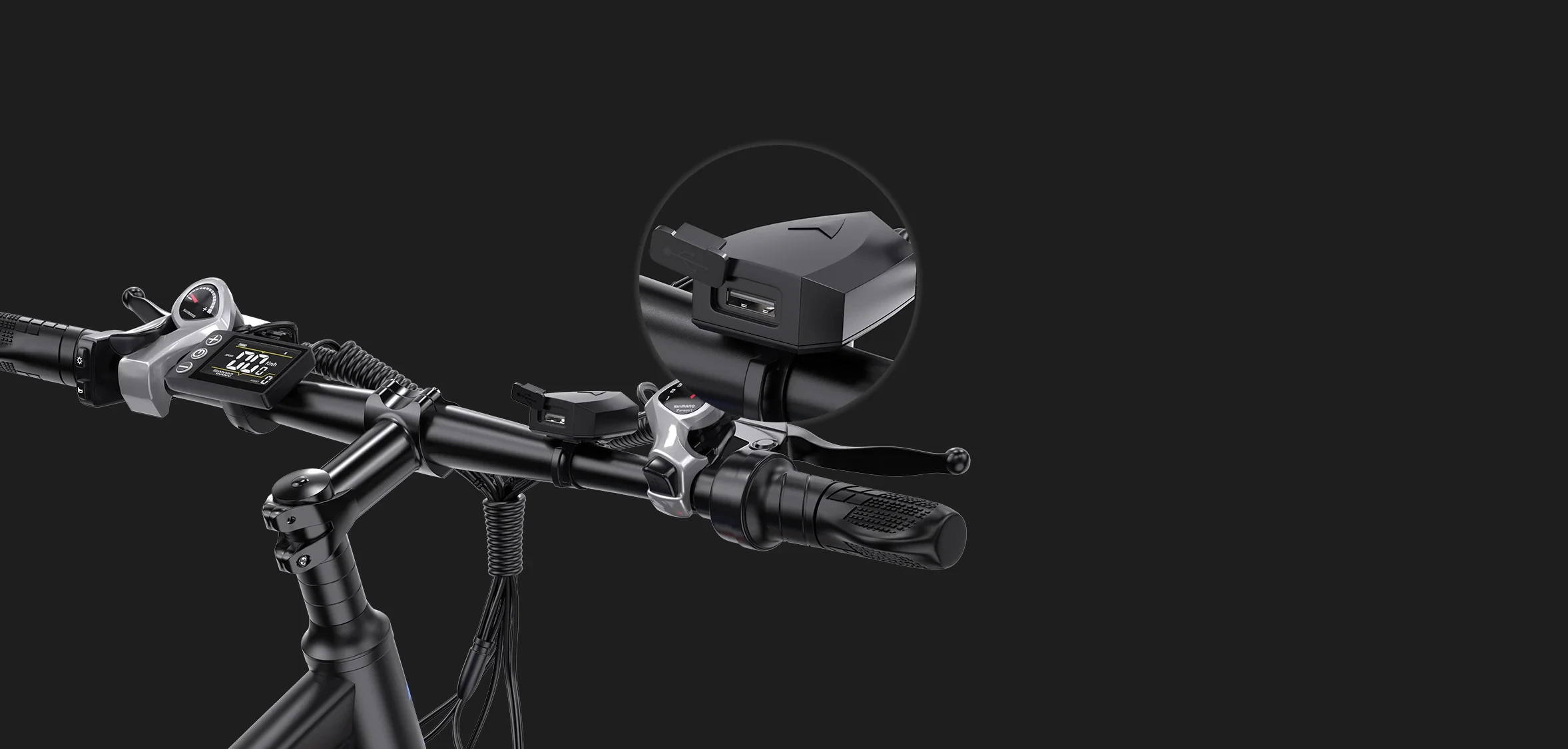 Ride worry-free, charge on the go! Our electric bicycle features a phone charging port in the handlebar area, allowing you to recharge your phone while riding. Whether it’s a long commute or a short trip, you never have to worry about running out of battery. Stay connected at all times and enjoy a smart and convenient riding experience.