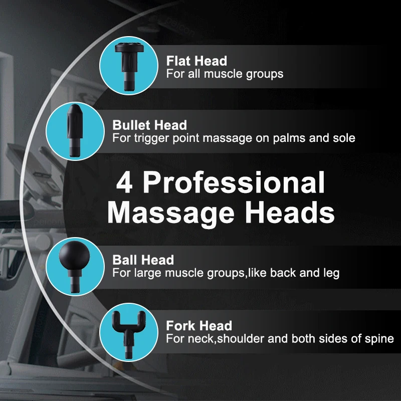 【LCD Screen & 4 Massage Heads】Featuring an intuitive LCD screen displaying mode, speed level, and battery life, our massage machine for back comes with 4 massage heads tailored to your diverse needs. To check battery level, simply press the power button briefly when the gun is off. Press and hold for 2 seconds to power on