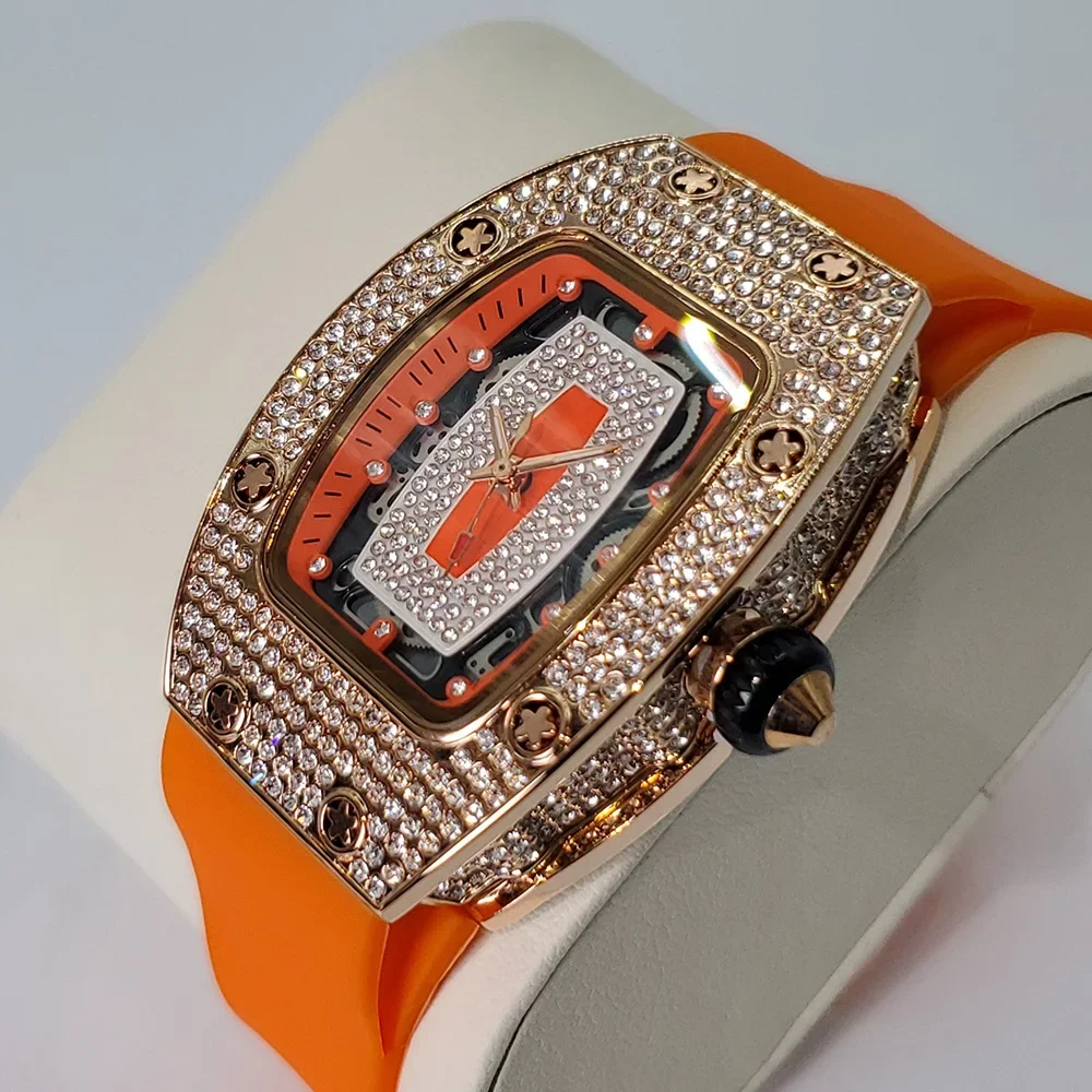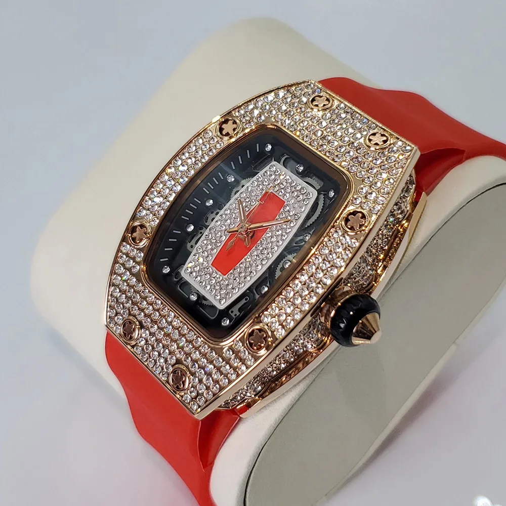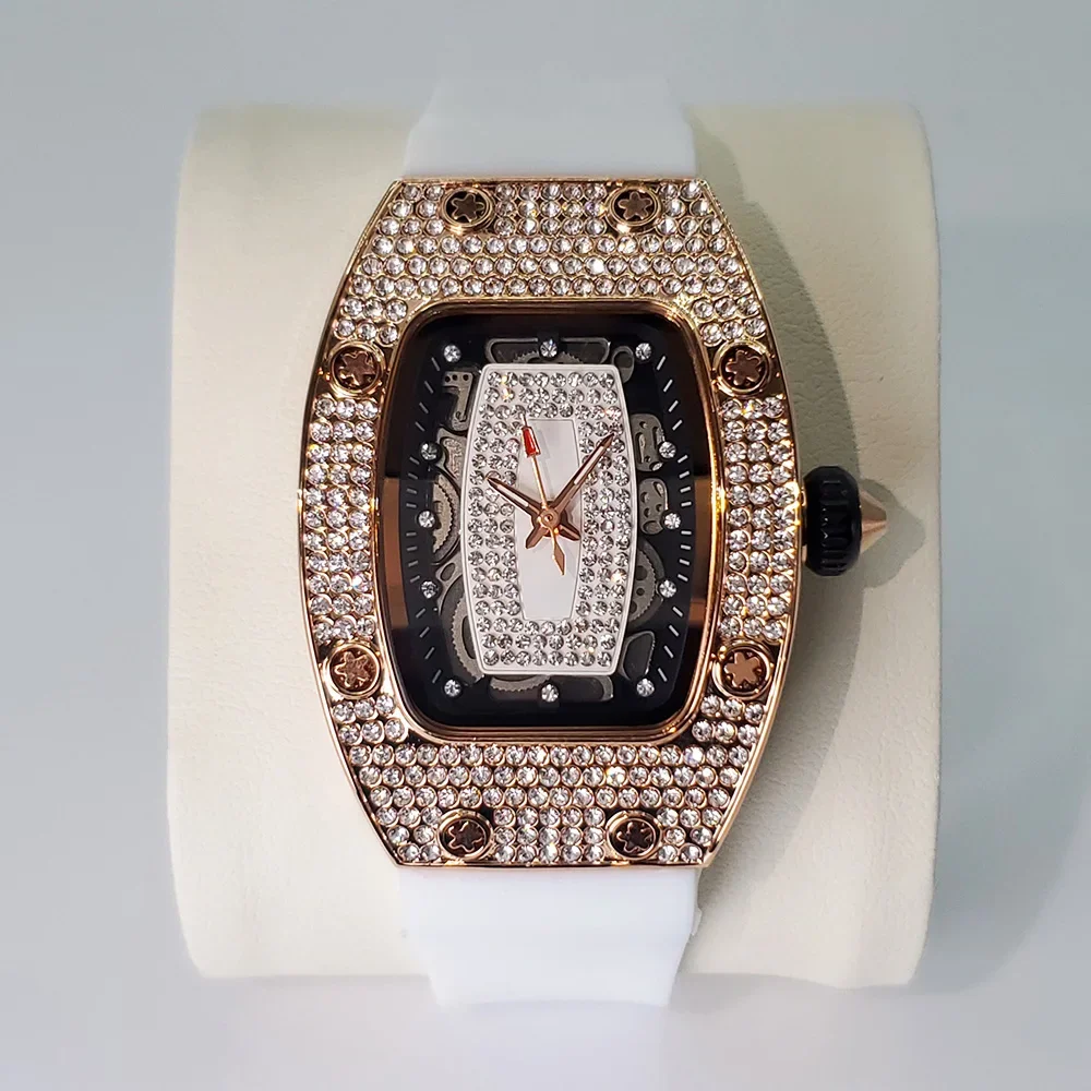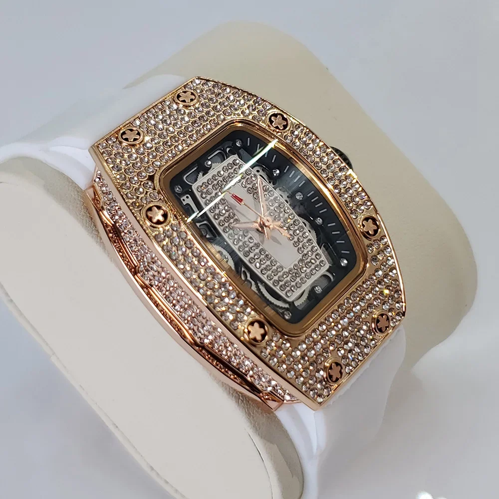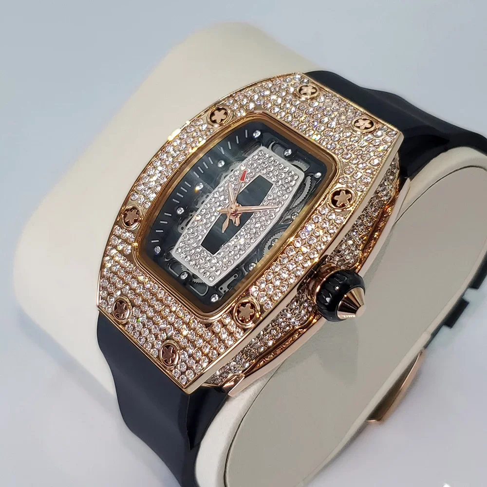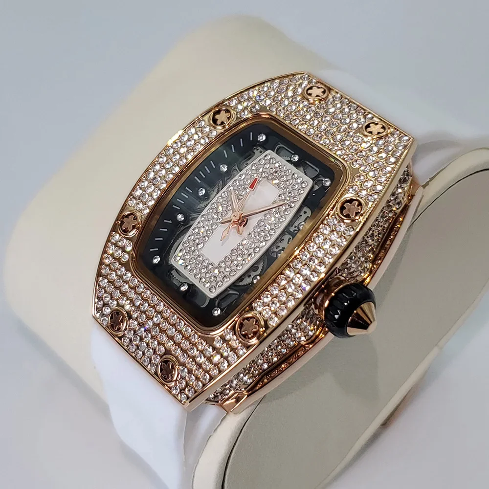 Fashion Rose Iced Watches Women Casual Silicone Strap Quartz Dress Full Diamond AAA Tonnneau Watch For Ladies Dropshipping