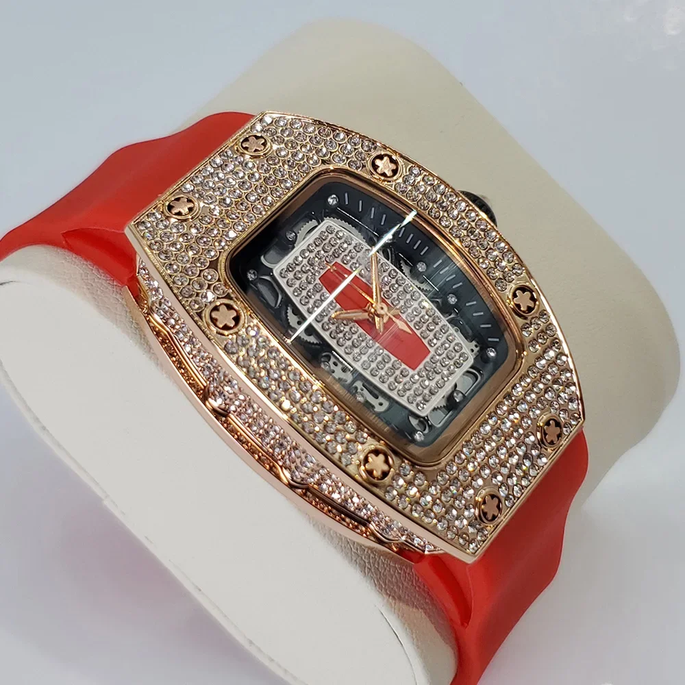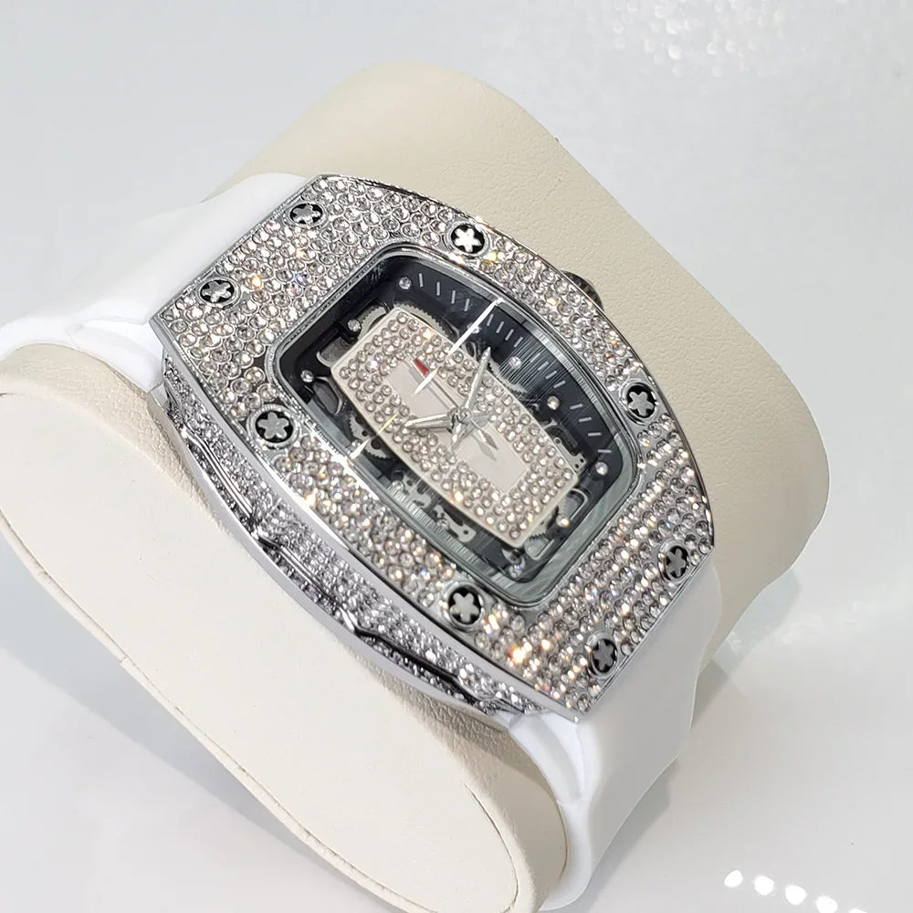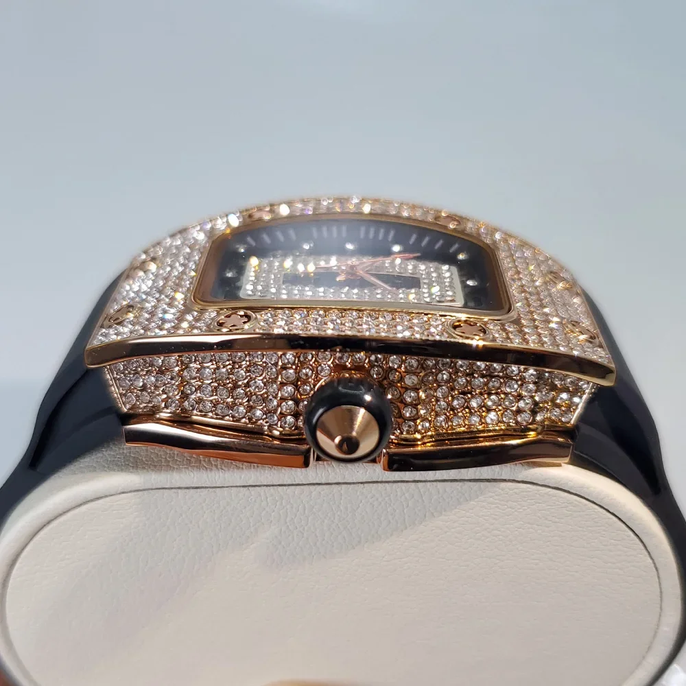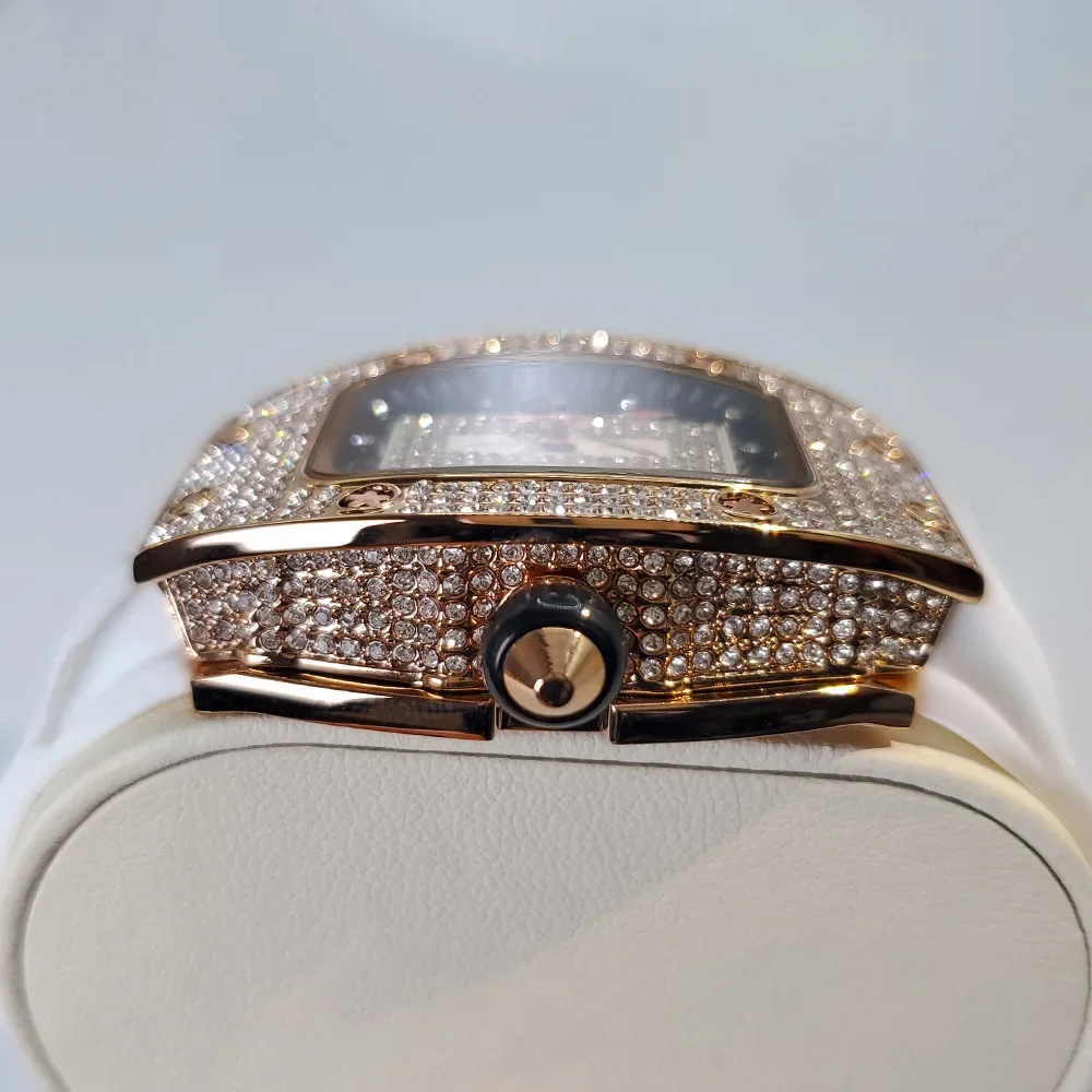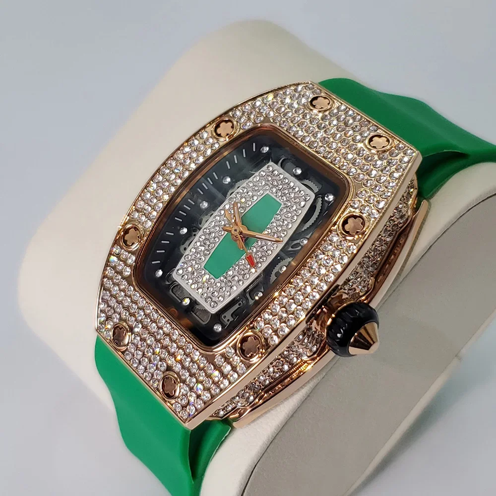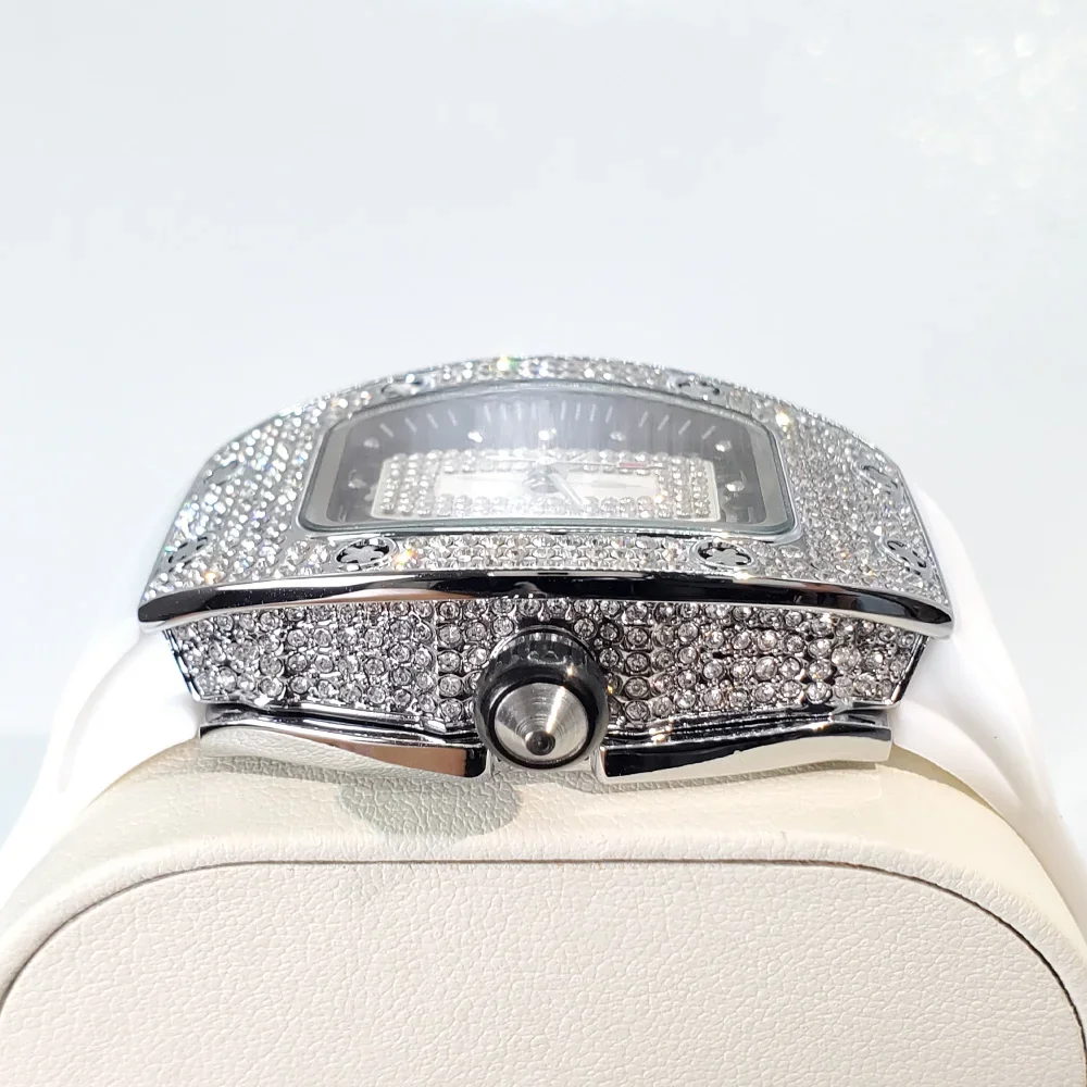 Fashion Rose Iced Watches Women Casual Silicone Strap Quartz Dress Full Diamond AAA Tonnneau Watch For Ladies Dropshipping