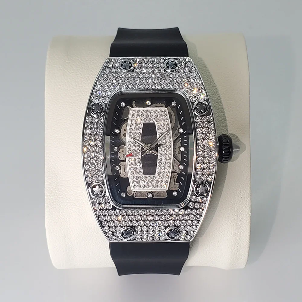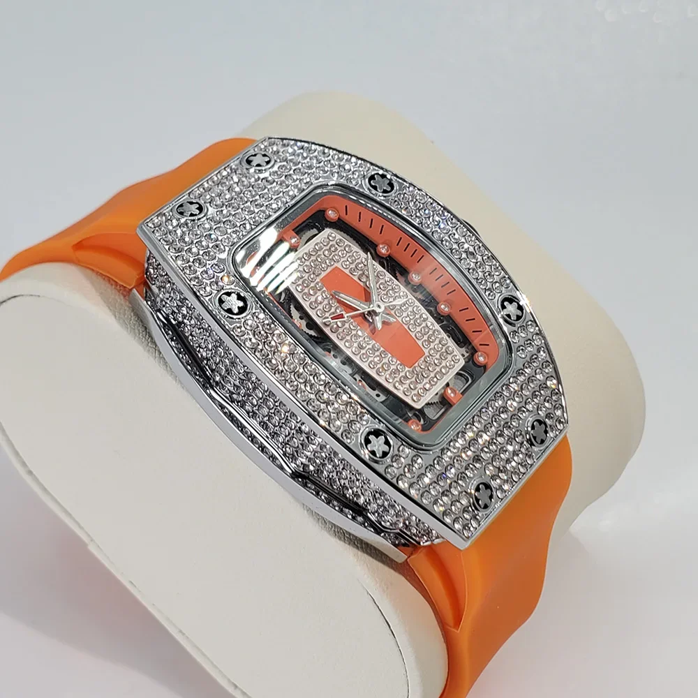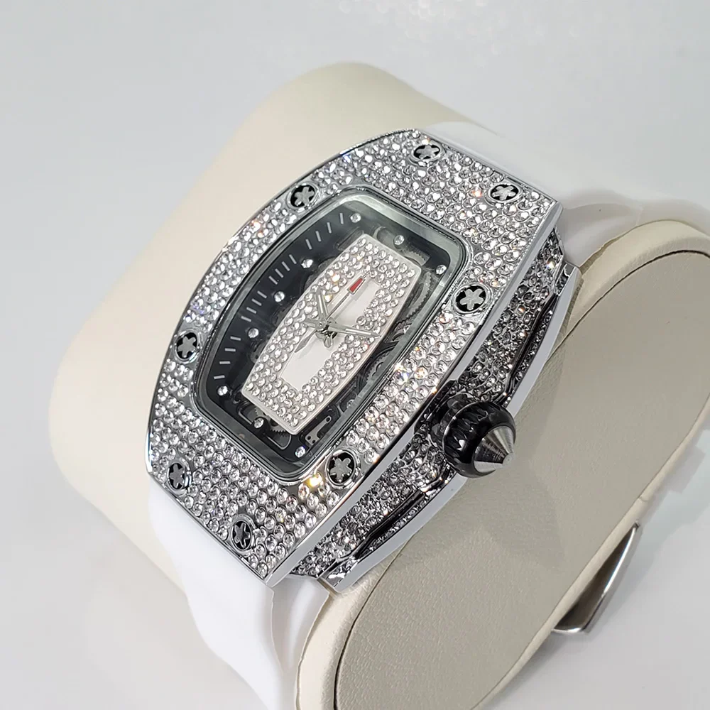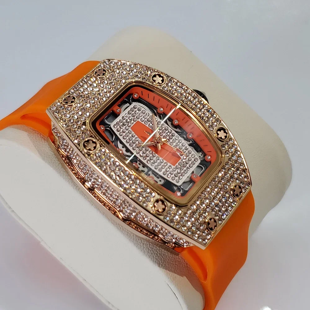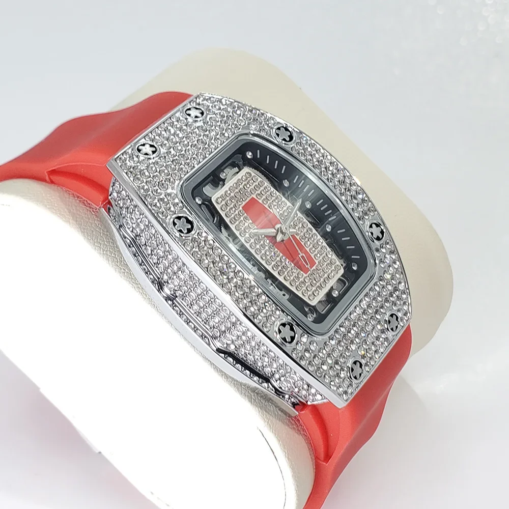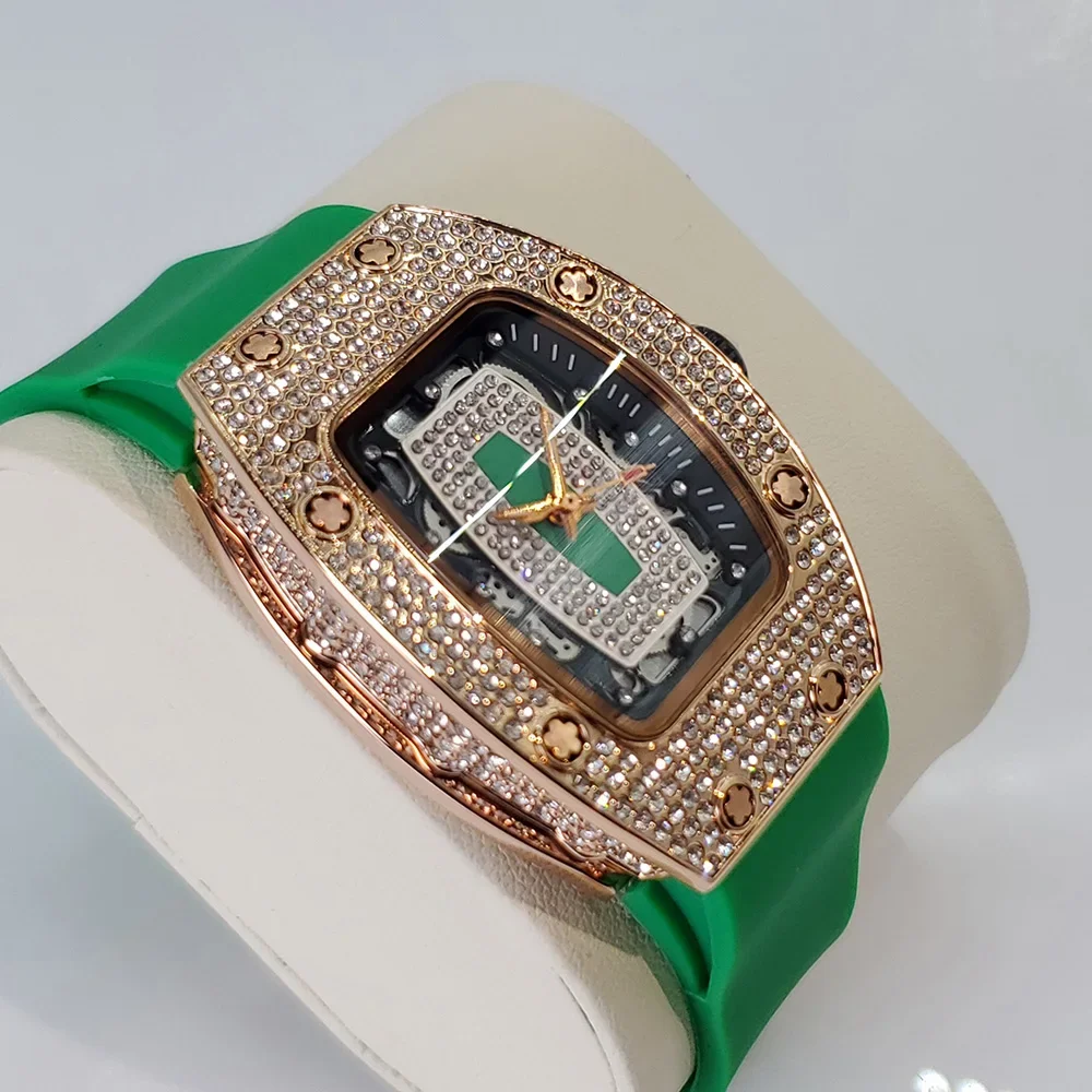 Fashion Rose Iced Watches Women Casual Silicone Strap Quartz Dress Full Diamond AAA Tonnneau Watch For Ladies Dropshipping