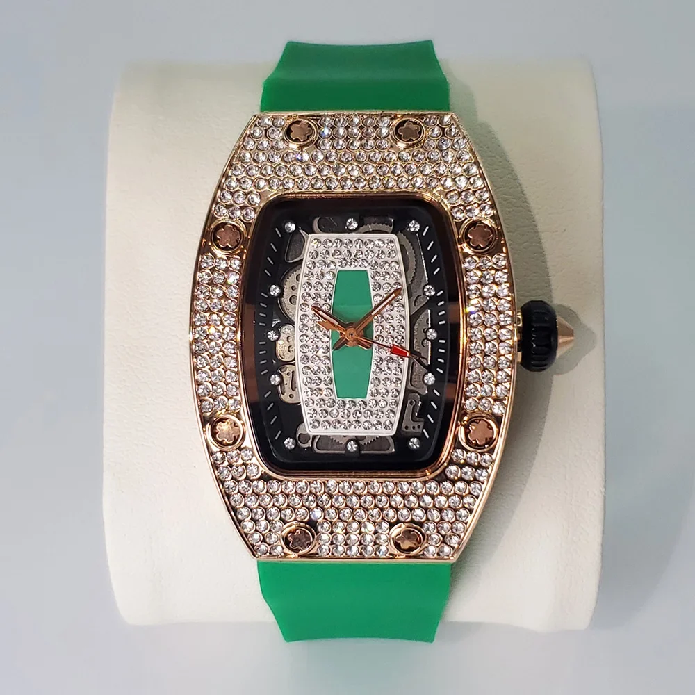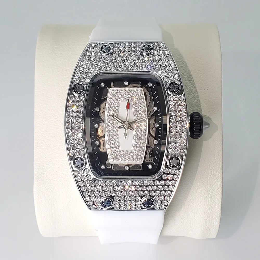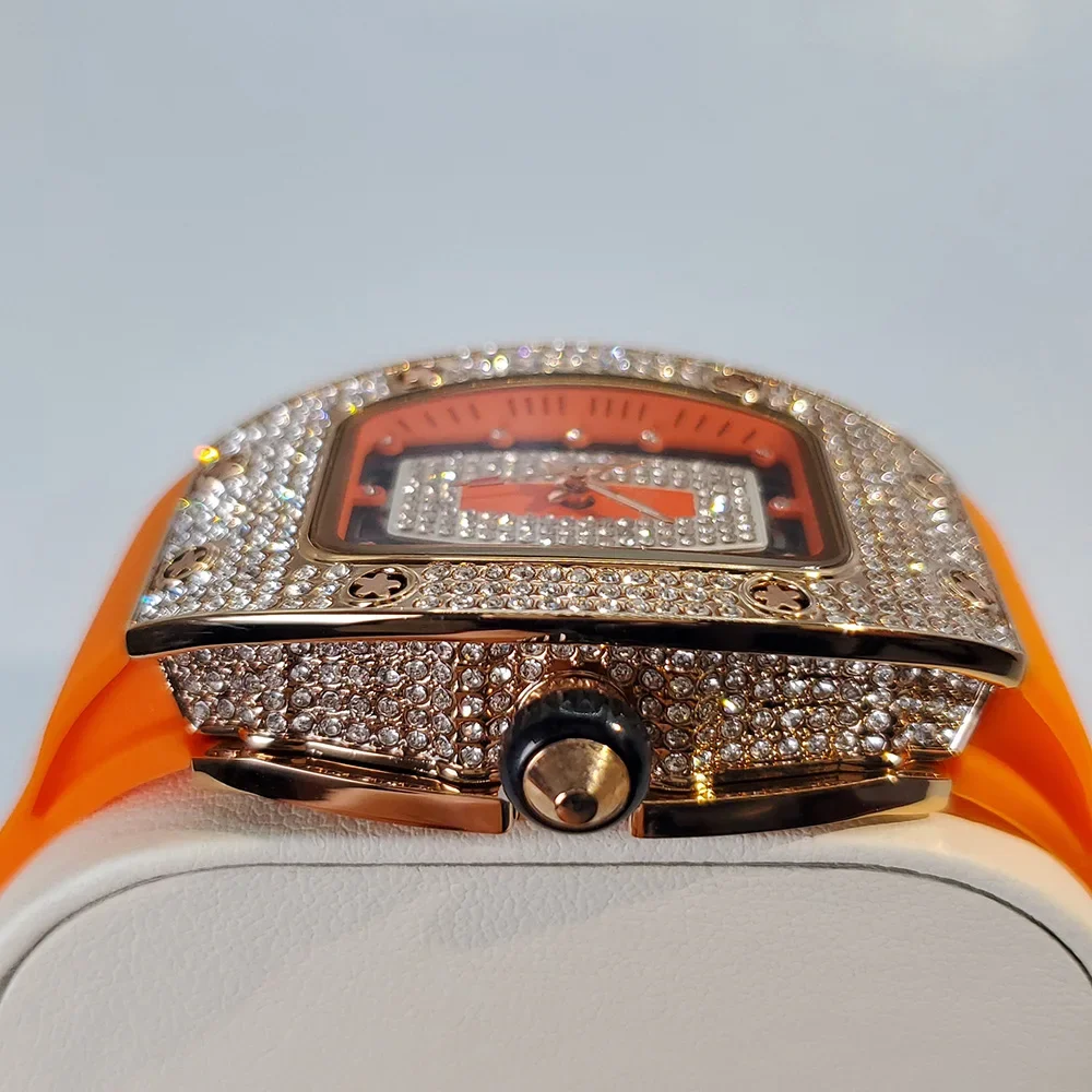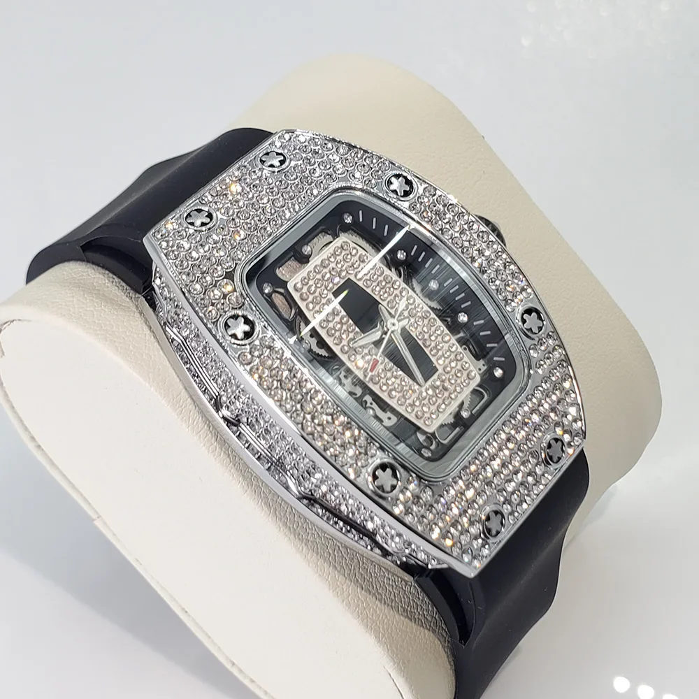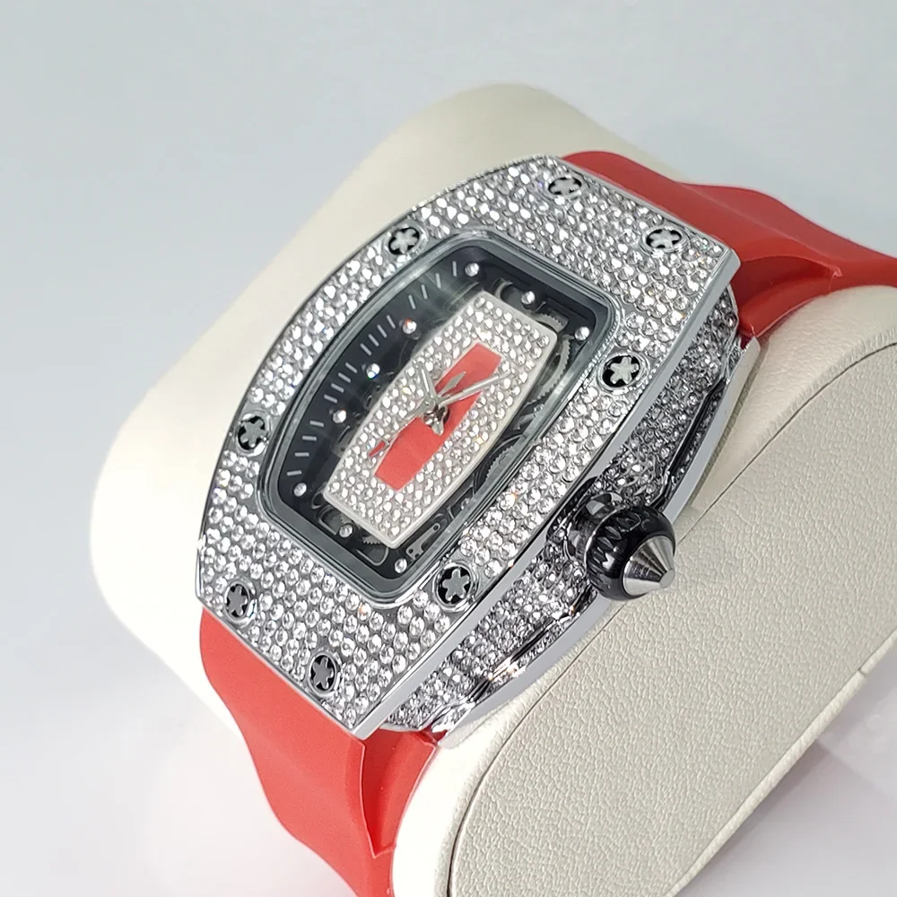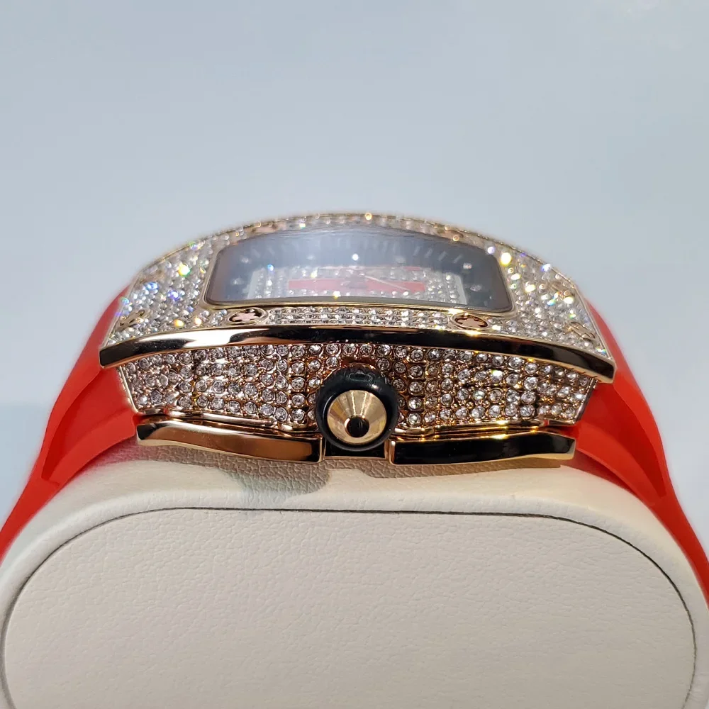 Fashion Rose Iced Watches Women Casual Silicone Strap Quartz Dress Full Diamond AAA Tonnneau Watch For Ladies Dropshipping