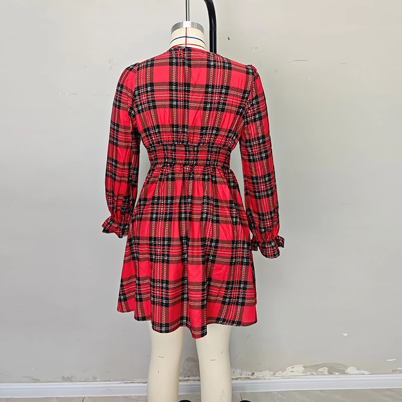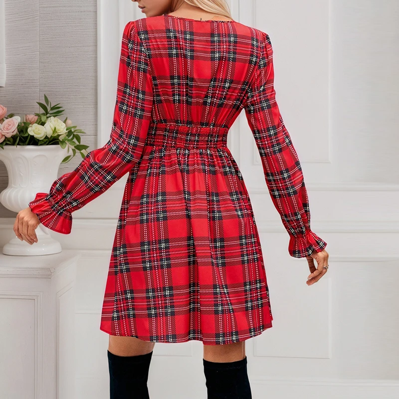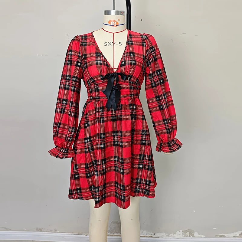 Fashion V Neck Plaid Printed A-line Mini Dress Women Casual Long Sleeve Knot Design Party Dress Women Christmas Dresses Red