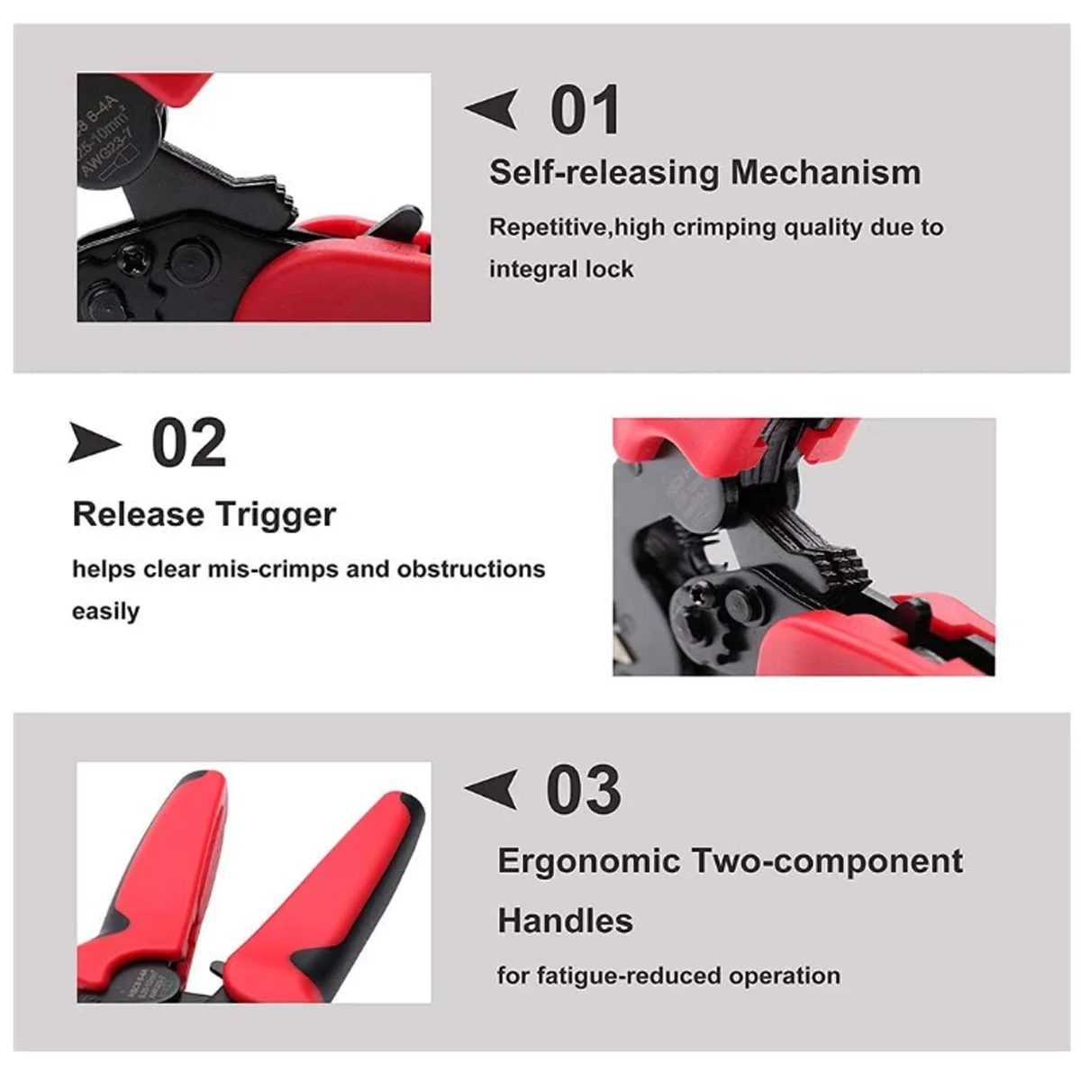 【Non-slip Comfortable Handle】The crimpers with curved design, classic red and blue color matching two-tone handle. Can be operated with one hand, ergonomic. Exquisite and compact, easy to carry. Fits the palm of your hand, comfortable grip, reduces fatigue from long-time use. Effectively improves work efficiency.