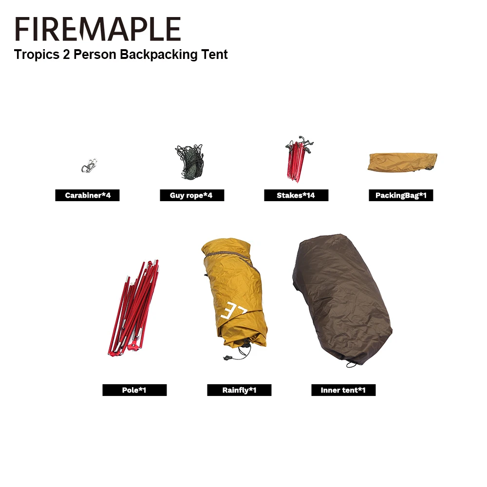 - Included Components: Rainfly* 1, Inner tent*1, Pole*1, Stakes*14, Guy rope*4, Packing Bag*1, Carabiner*4, Patch kit*1