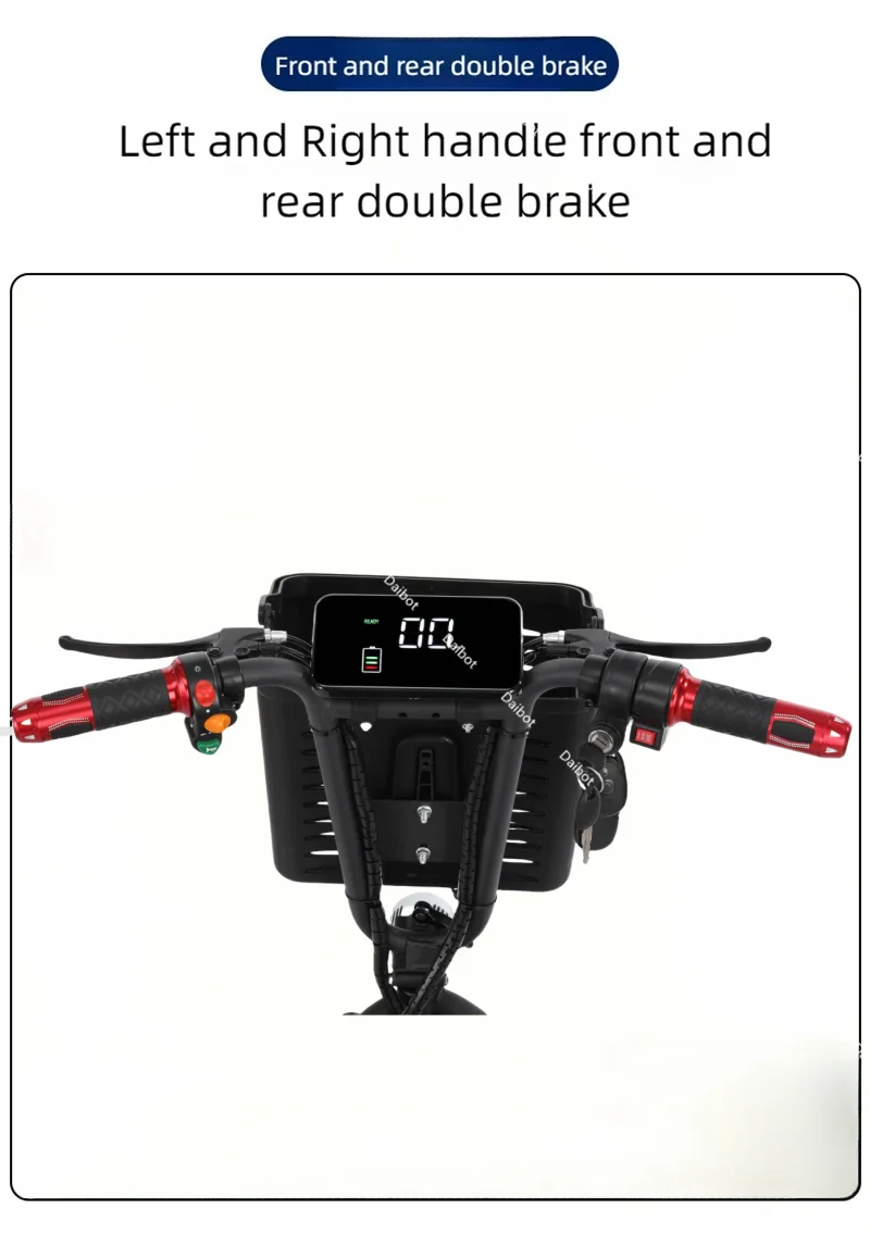 Feature: Front And Rear Dual Brakes,Comfortable Seat, Three Speed Transmission, Front Basket, Horn, LED Headlight, LED Display, Power Display,Turn Light, The seat can be adjusted up and down