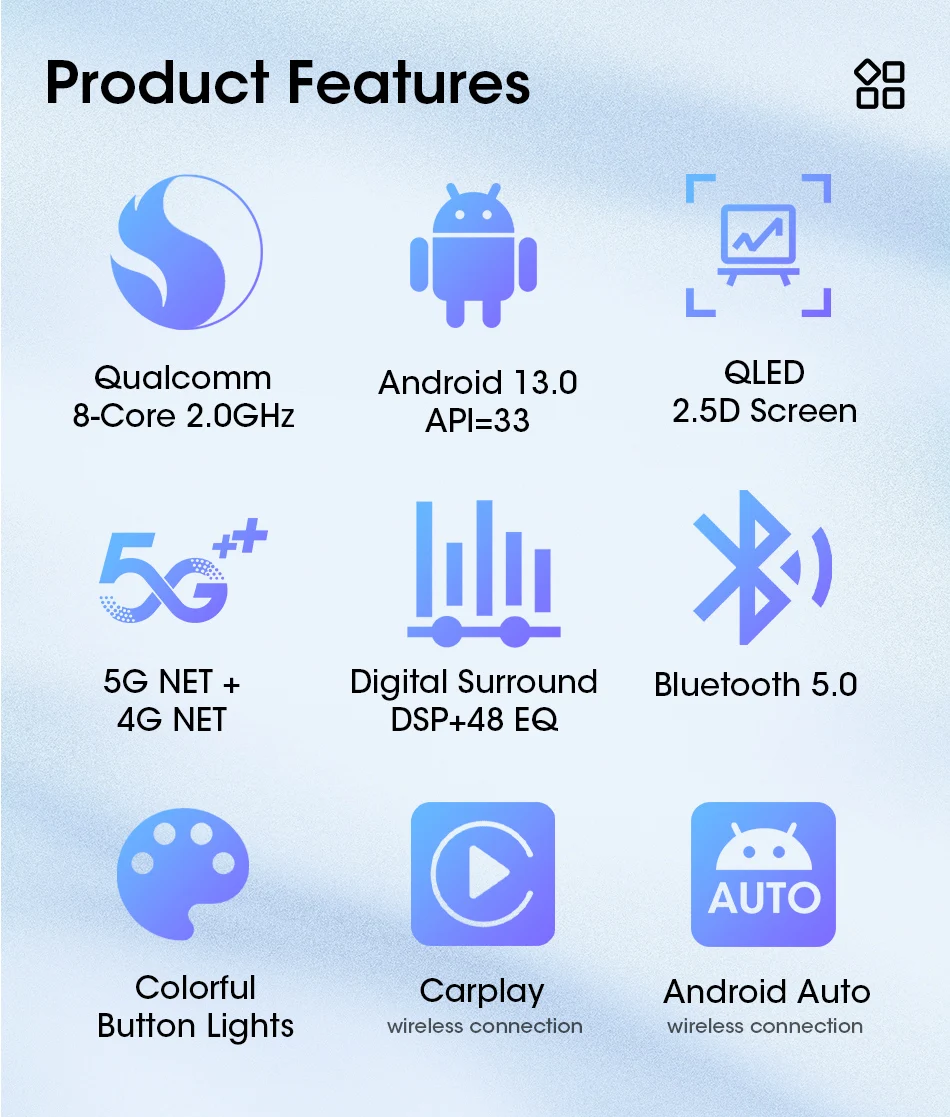 Built in Carplay and Android Auto, supporting wired and wireless connections.