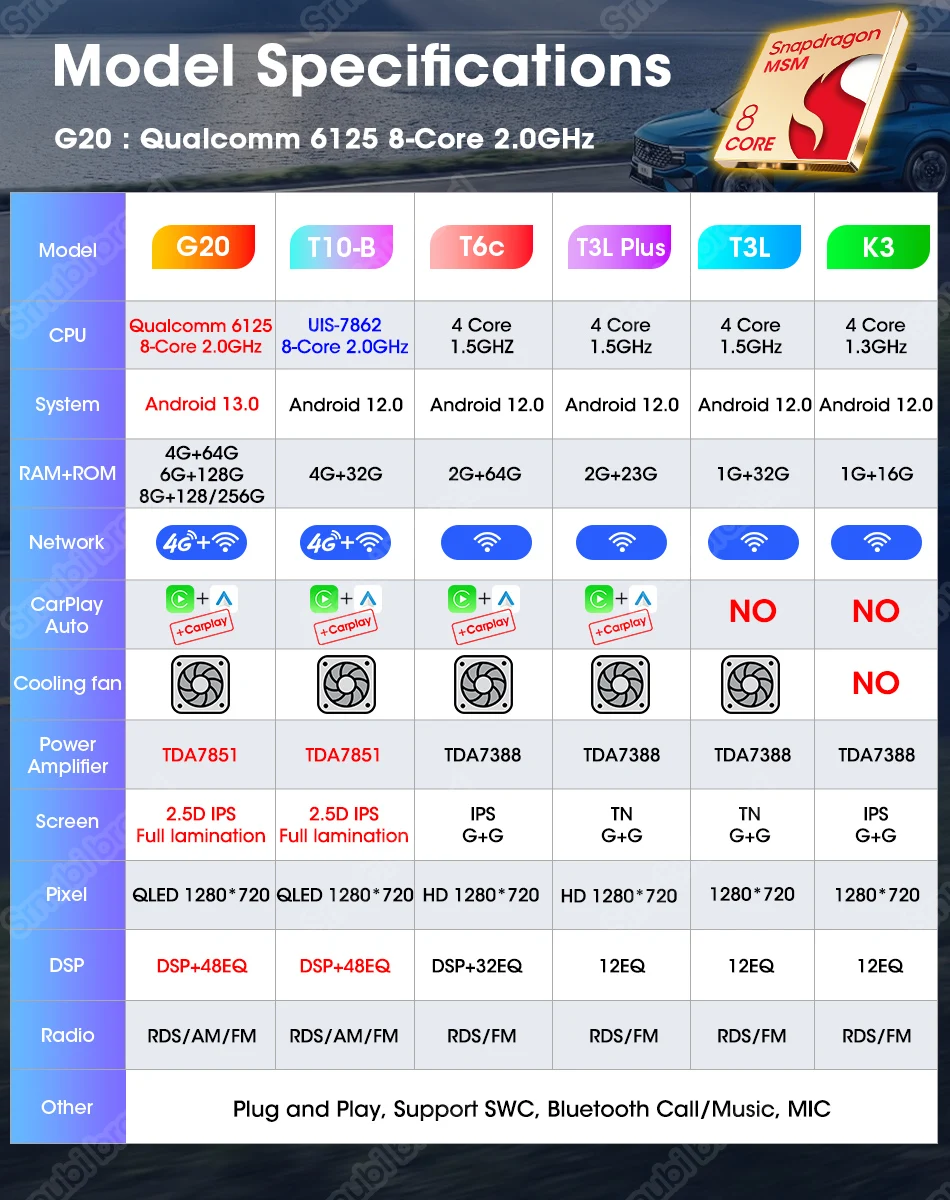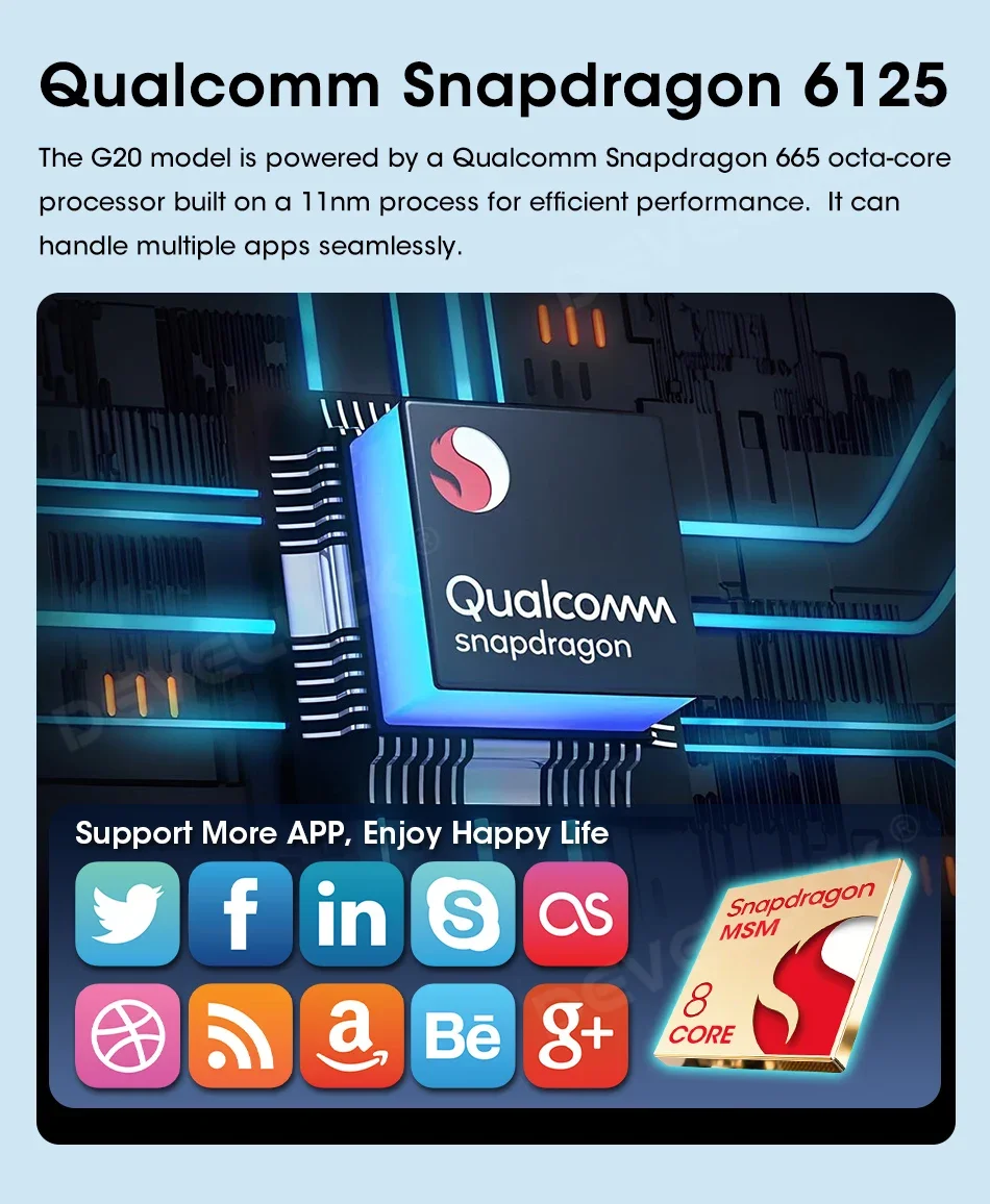 - Chipset: 8 Core Qualcomm 6125(G20-C~G20-F)