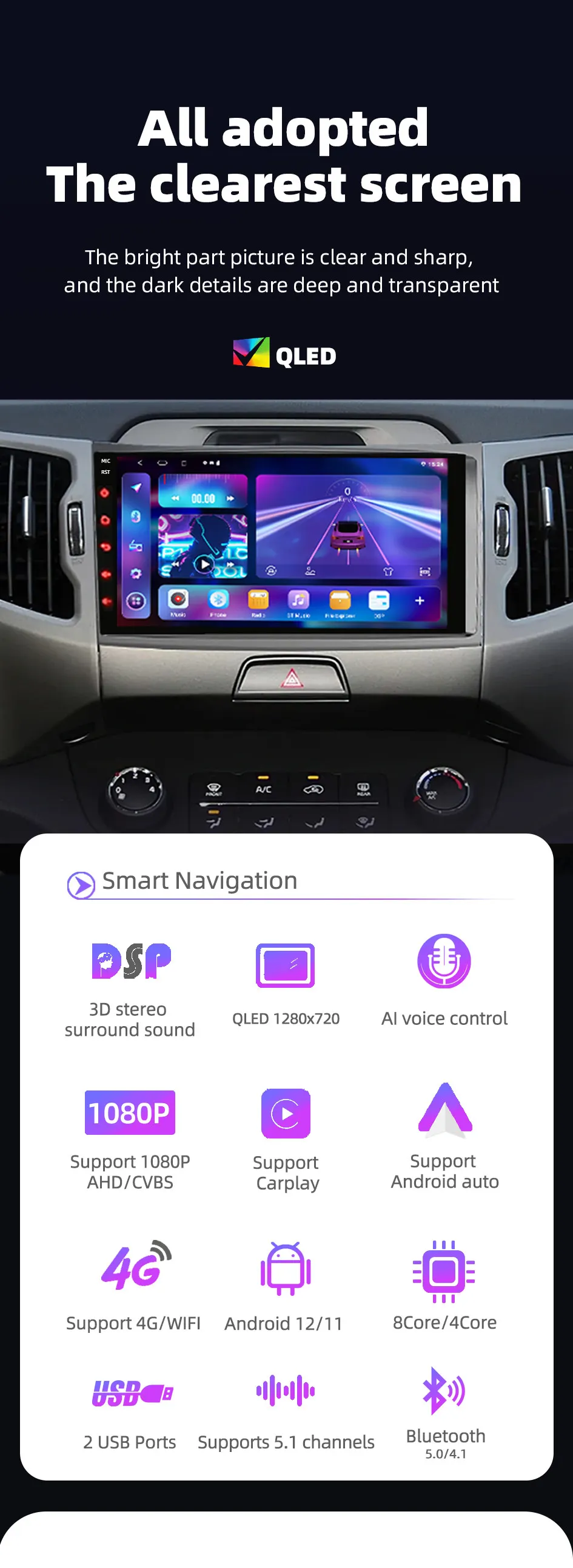 Android 11/12+QLED 1280×720+4 cores/8 cores+1GB flash memory (2GB/4GB/6GB/8GB optional) + 32GB memory (32GB/64GB/128GB optional) + WIFI (4G network optional) + steering wheel control + RDS/DSP (optional)