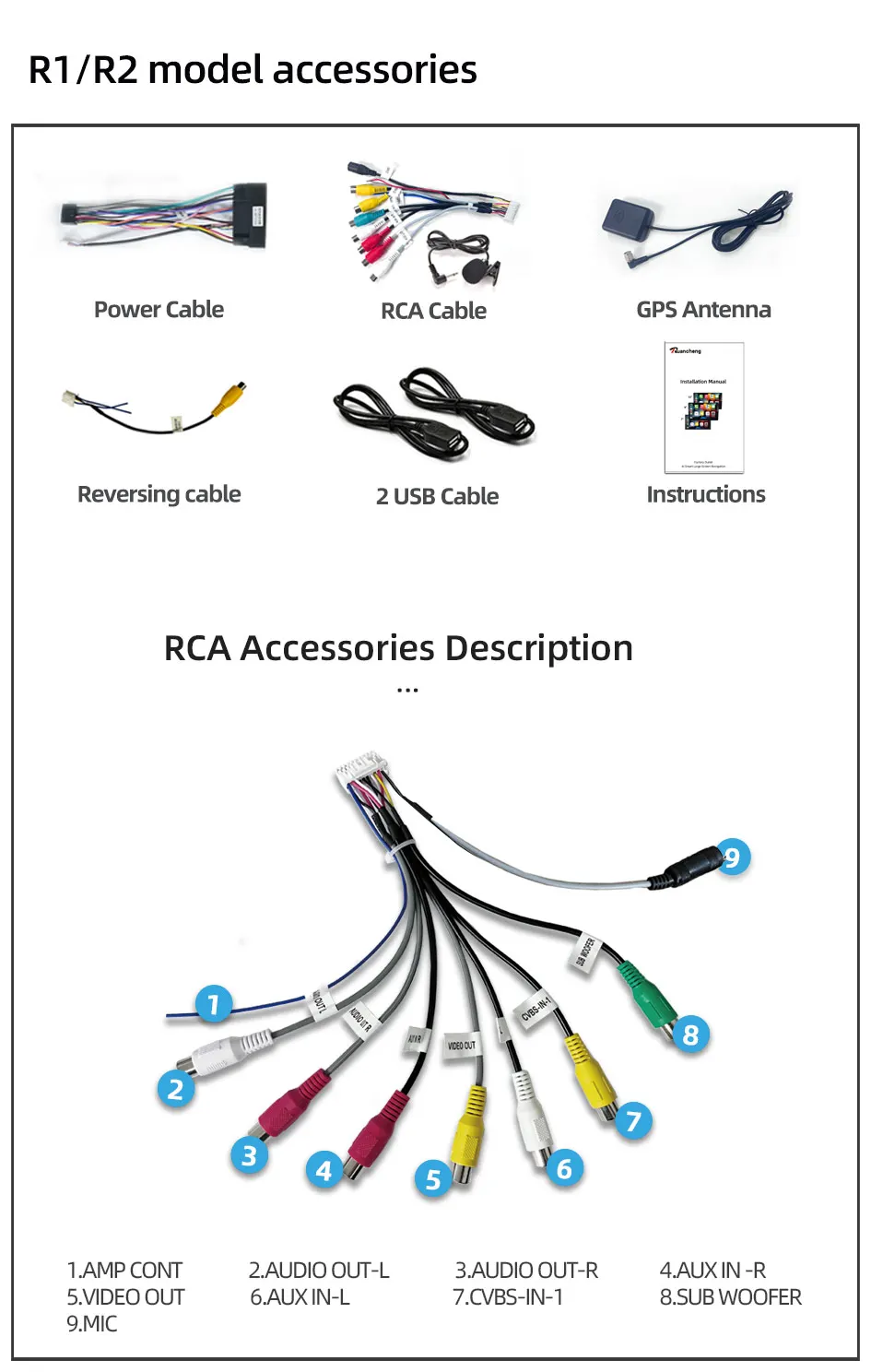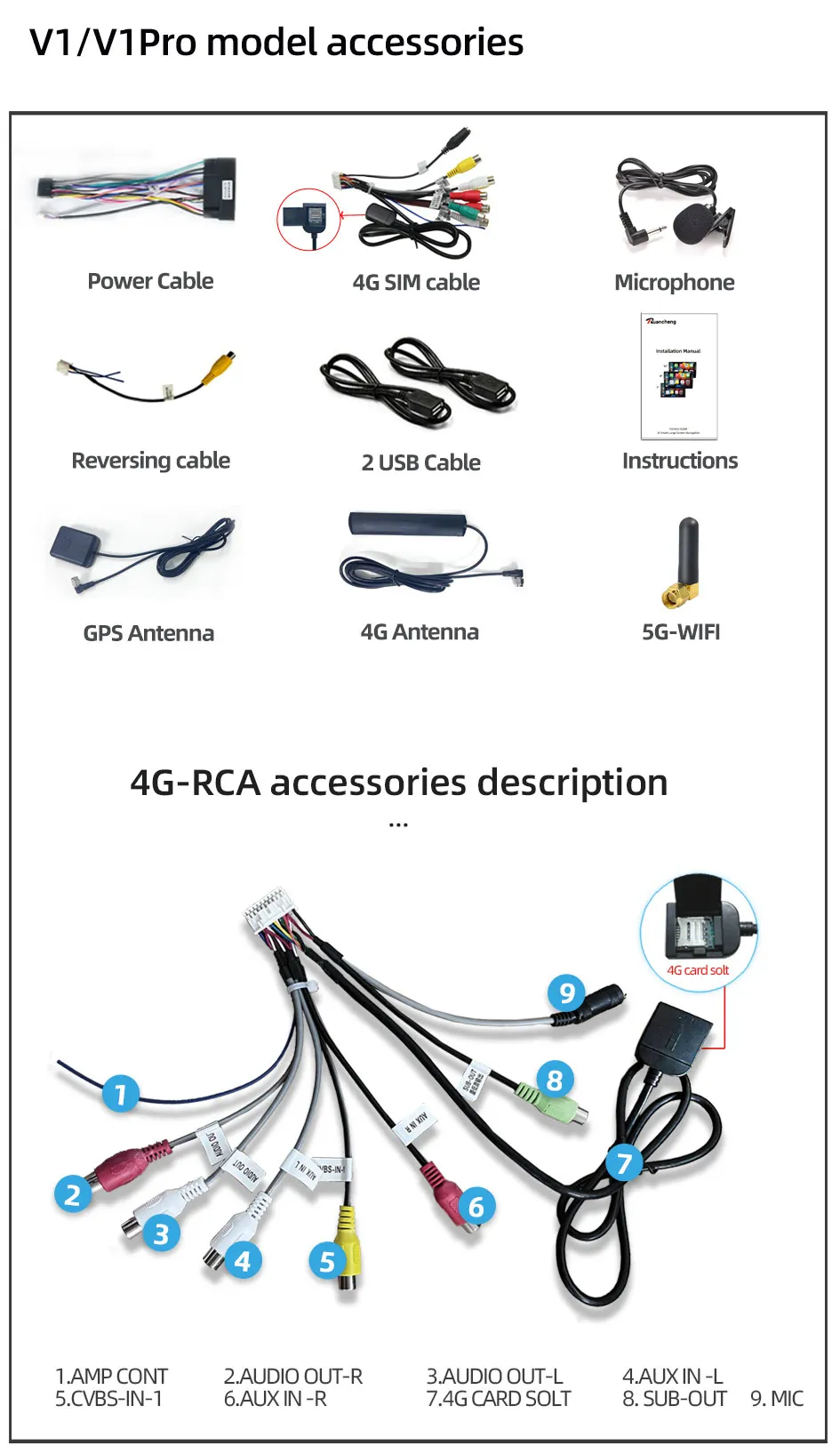 ① Frame ② Machine ③ Power cord ④ 4G SIM Cable ⑤Reversing cable ⑥ 2 x USB cable ⑦ Instructions ⑧ GPS Antenna ⑨ 4G Antenna ⑩ 5G-WIFI